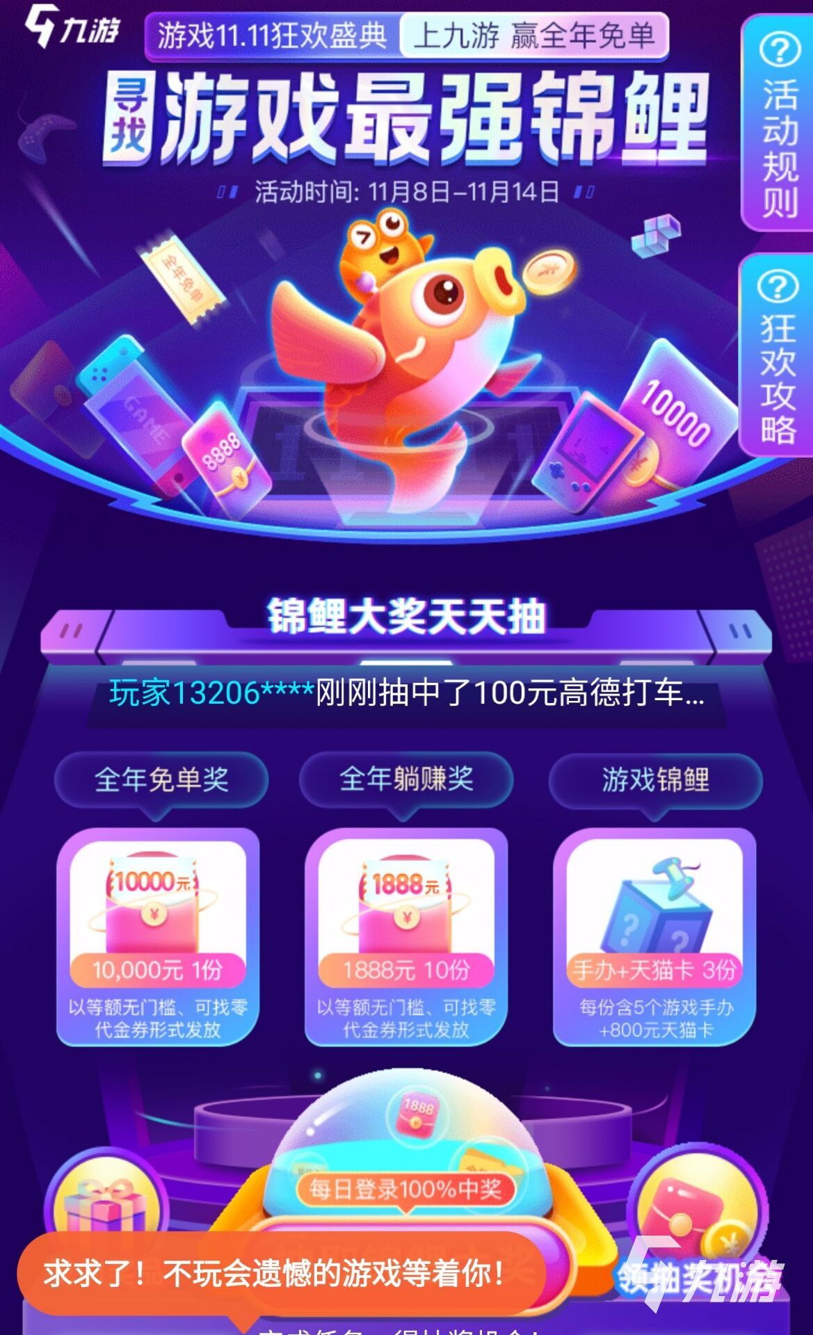 在這里九游平臺(tái)也給大家準(zhǔn)備了一波福利,趁著今天是雙十一的日子,大家只要登錄九游app點(diǎn)擊右下角的免單界面,或者是主頁(yè)橫幅的雙十一福利頁(yè)面,簡(jiǎn)單的瀏覽,完成一些任務(wù)之后,就可以獲取操作的抽獎(jiǎng)次數(shù),更有全年免單獎(jiǎng)以及全年躺賺獎(jiǎng)1萬(wàn)元紅包等待各位玩家領(lǐng)取,運(yùn)氣好的玩家,抽到拼手氣648紅包將直接打款到支付寶,趕快下載九游app試試歐皇手氣吧。