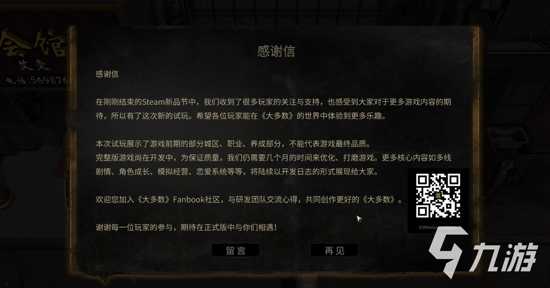 與中介阿姨結(jié)束對話后,會跳出官方的一封感謝信,代表本次試玩到這里就結(jié)束了,試玩中展示了游戲前期的部分城區(qū)、職業(yè)、養(yǎng)成部分,但不代表游戲的最終品質(zhì),游戲仍在開發(fā)中,還需要幾個月的時間來進(jìn)行優(yōu)化和打磨,并且將會在后續(xù)的開發(fā)日志中為玩家透露多線劇情、角色成長、戀愛系統(tǒng)等多種內(nèi)容。