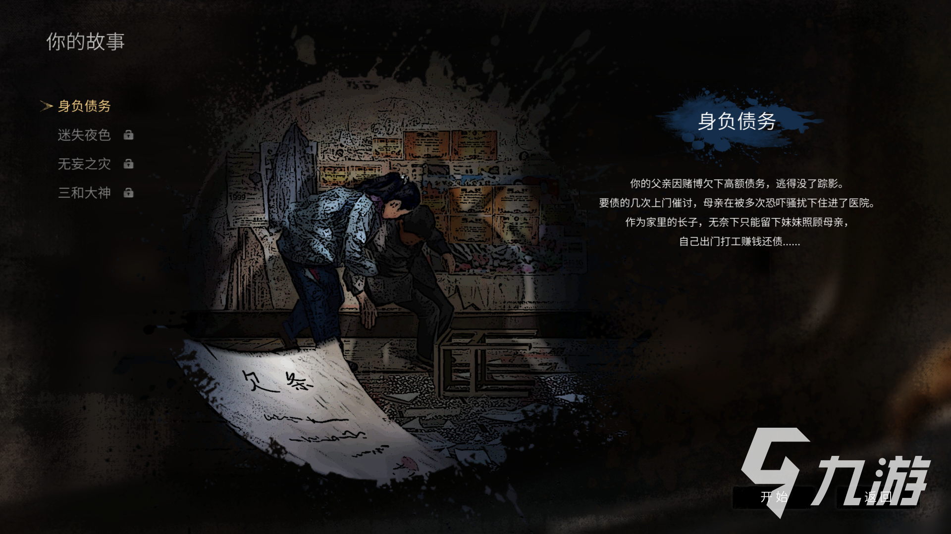 在第一個故事《身負(fù)債務(wù)》中,主角的父親因為嗜賭而欠下高額賭債,卻拋棄家庭,不知所蹤,留給主角的只是一身的債務(wù)。而母親又因為高利貸的暴力催收,不堪重負(fù),病倒在床。無奈,只好留下妹妹在家中肚子照顧母親,男主角自己進(jìn)入大城市尋找工作,償還賭債,渴望給母親、妹妹帶來好的生活。