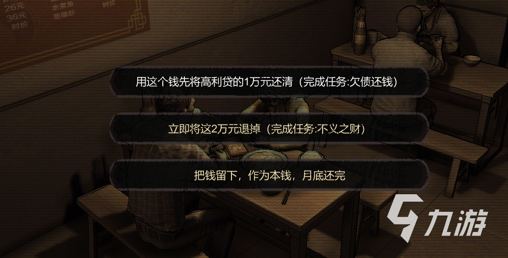 晚上休息時,我們需要操縱角色,選擇將這兩萬元退回或是留下,每種選擇都會指向一個不同的結(jié)局,需要仔細考量。