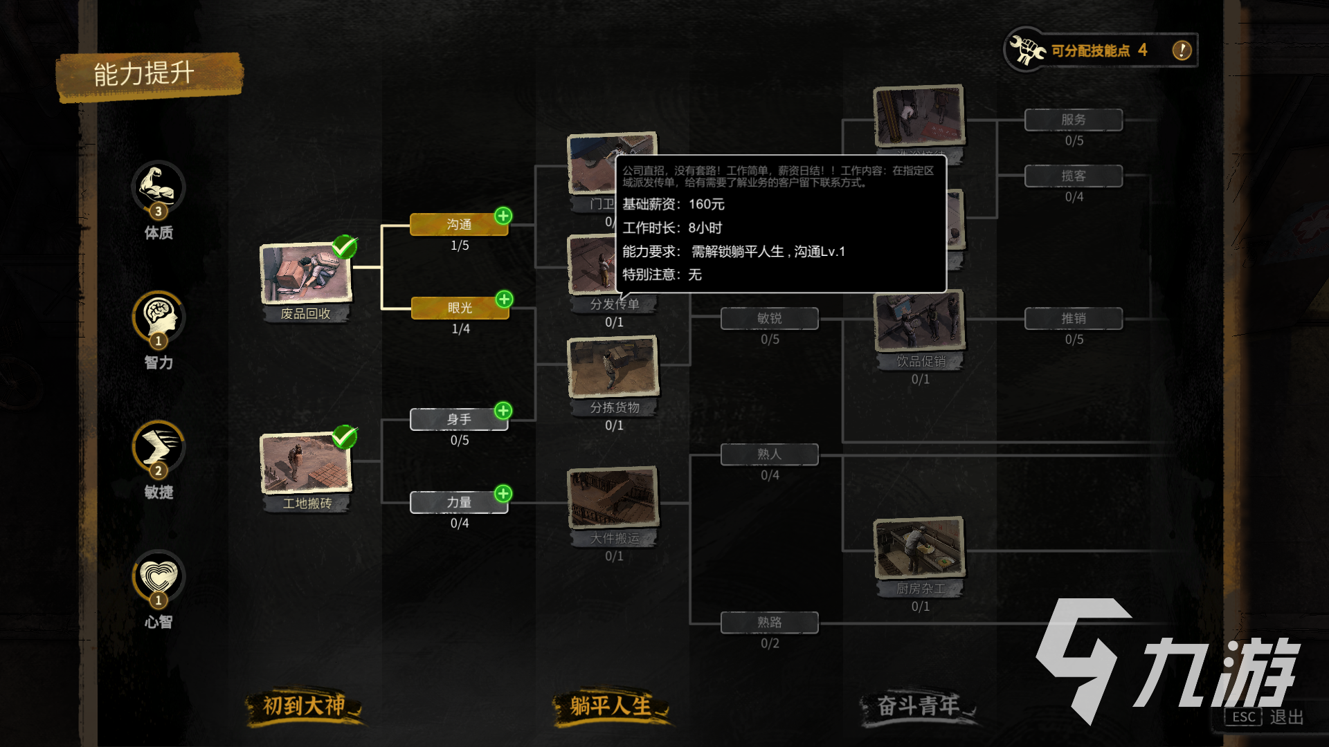 這時我們就需要將自己的溝通等級提升至1級,再使用1技能點學會“分發(fā)傳單”的技能,就可以去做發(fā)傳單的工作了。