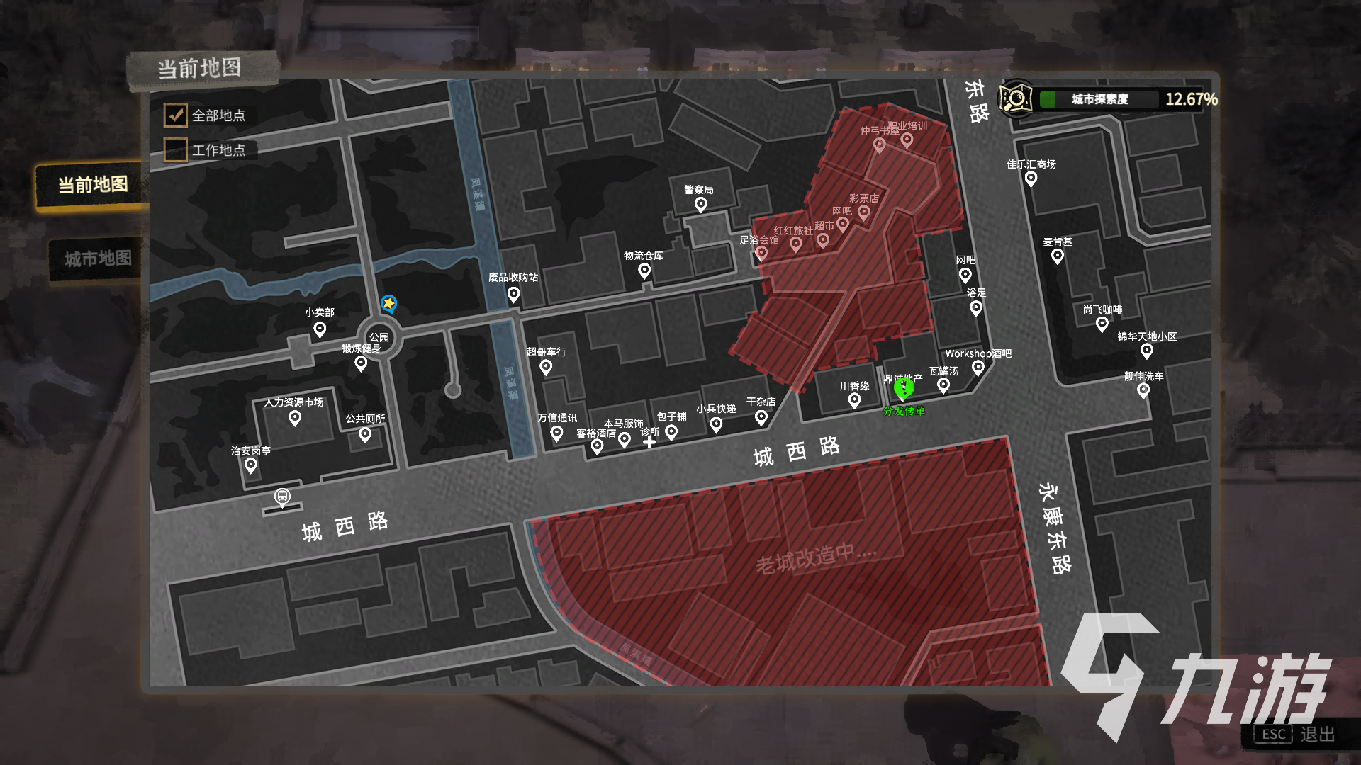 在游戲中打氣球的攤位位于地圖中公園的這個位置,我們可以通過騎車或走路前往。