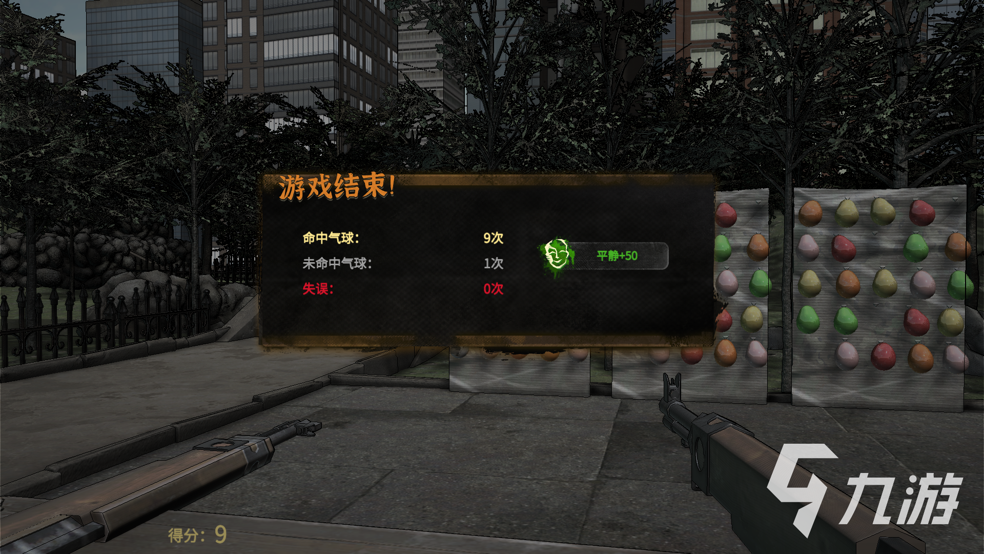 當(dāng)十發(fā)子彈用完或倒計時三十秒結(jié)束后,游戲結(jié)束,玩家會根據(jù)命中氣球的次數(shù)獲得相應(yīng)的平靜情緒加成,擊中的氣球數(shù)量越多,平靜值加得就越多,最高可獲得五十點。