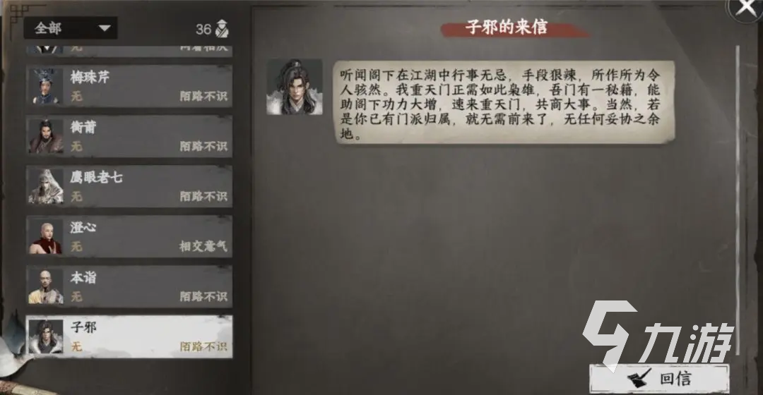 道德值不滿足條件的話,可以嘗試去找路人,與其交互,劫殺路人,就能有效降低道德點;當(dāng)?shù)赖曼c滿足后,就有機會收到子邪的飛鴿傳書,信中他會告訴大家可以加入到重天門,這時就要到指定地點和他進(jìn)行對話,并接受他的邀請。
