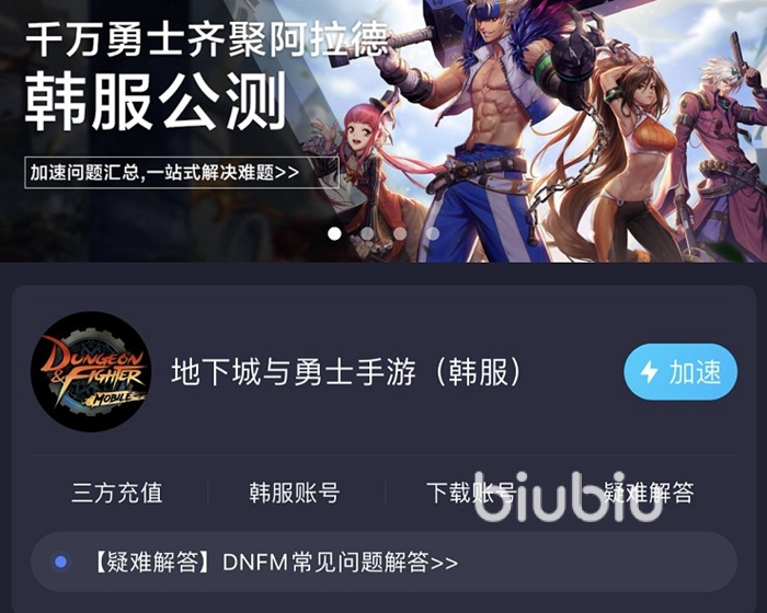 這里也順便提及一下,dnf手游韓服的充值還是比較麻煩的,而且游戲的下載本身也是需要花一定時(shí)間的。有任何關(guān)于dnf手游仿佛的問題,大家都能夠在biubiu加速器的dnf手游韓服專區(qū)中找到對(duì)應(yīng)的解決方法,還能夠?qū)nf手游國(guó)服進(jìn)行預(yù)約。