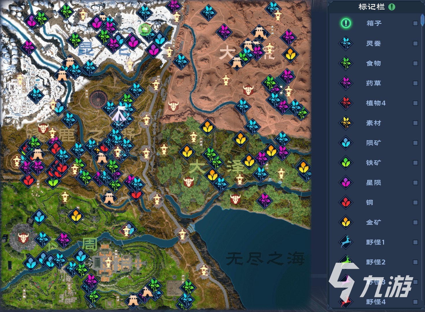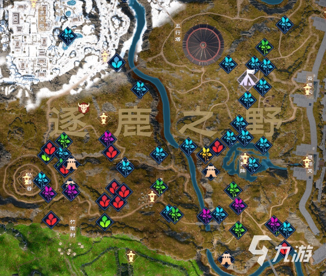 小伙伴們在地圖上就可以找到千載靈蠶,其標記就是一個藍色花葉的樣子,其分布位置是比較多的,共計能找到四十多個,全部采集到的話預計能收獲兩百多個,具體的采集位置如下: