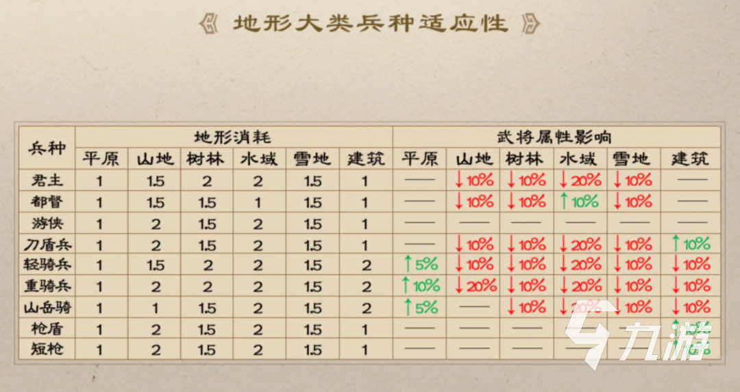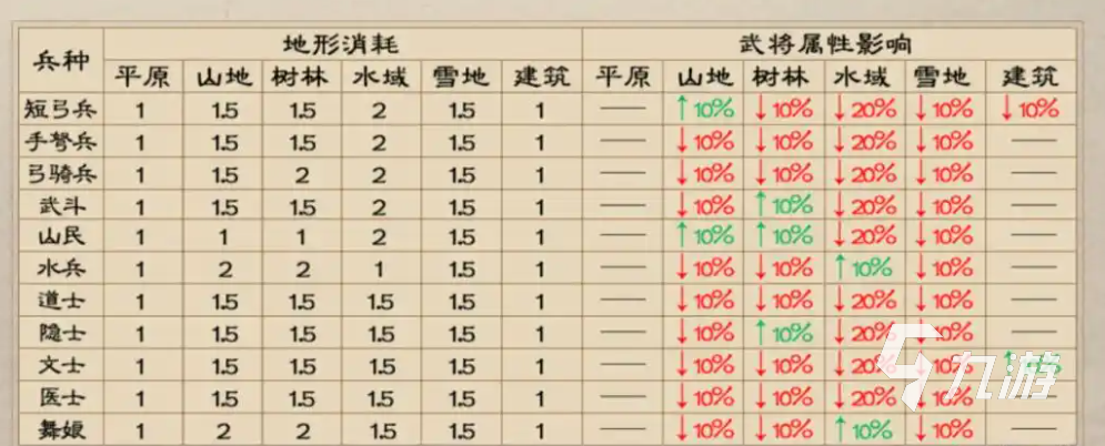 除了兵種克制以外,游戲中另一個(gè)影響兵種發(fā)揮的因素就是地形了。像平原地形中,大部分騎兵的屬性會(huì)獲得小幅的提升。而在山地中,大部分兵種的屬性或多或少都有所下降,不過短弓兵的屬性卻有小幅的提升,大家在遇到山地地形的時(shí)候,可以讓短弓兵打頭陣。而在樹林、水域、雪地等地形中,不同兵種各自受到的影響也各不相同,玩家需要根據(jù)地形來決定出戰(zhàn)的兵種。
