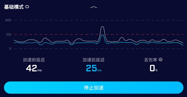在加速開啟之后我們可以看到加速過程中的網(wǎng)絡(luò)延遲情況,左上方也可以進(jìn)行加速模式的切換。目前加速器支持基礎(chǔ)模式以及智能模式這兩種,大家可以根據(jù)自己的情況進(jìn)行選用。