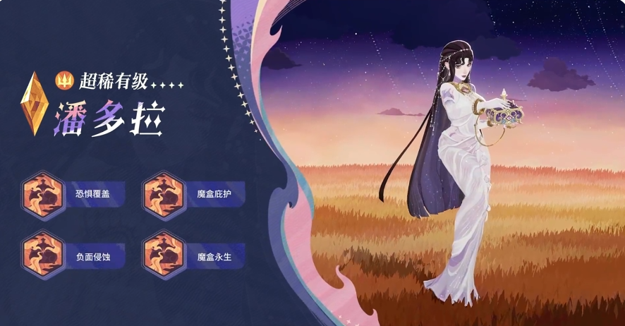 必殺技“災(zāi)厄釋放”,潘多拉的魔盒中存有災(zāi)禍和希望;主動釋放時,打開魔盒釋放災(zāi)厄,將場上所有角色向所屬陣營方向恐懼一段時間;受影響的角色將在此期間流失生命值,恐懼效果結(jié)束后,持續(xù)一段時間,這個削弱效果可疊加,但是存在有上限。