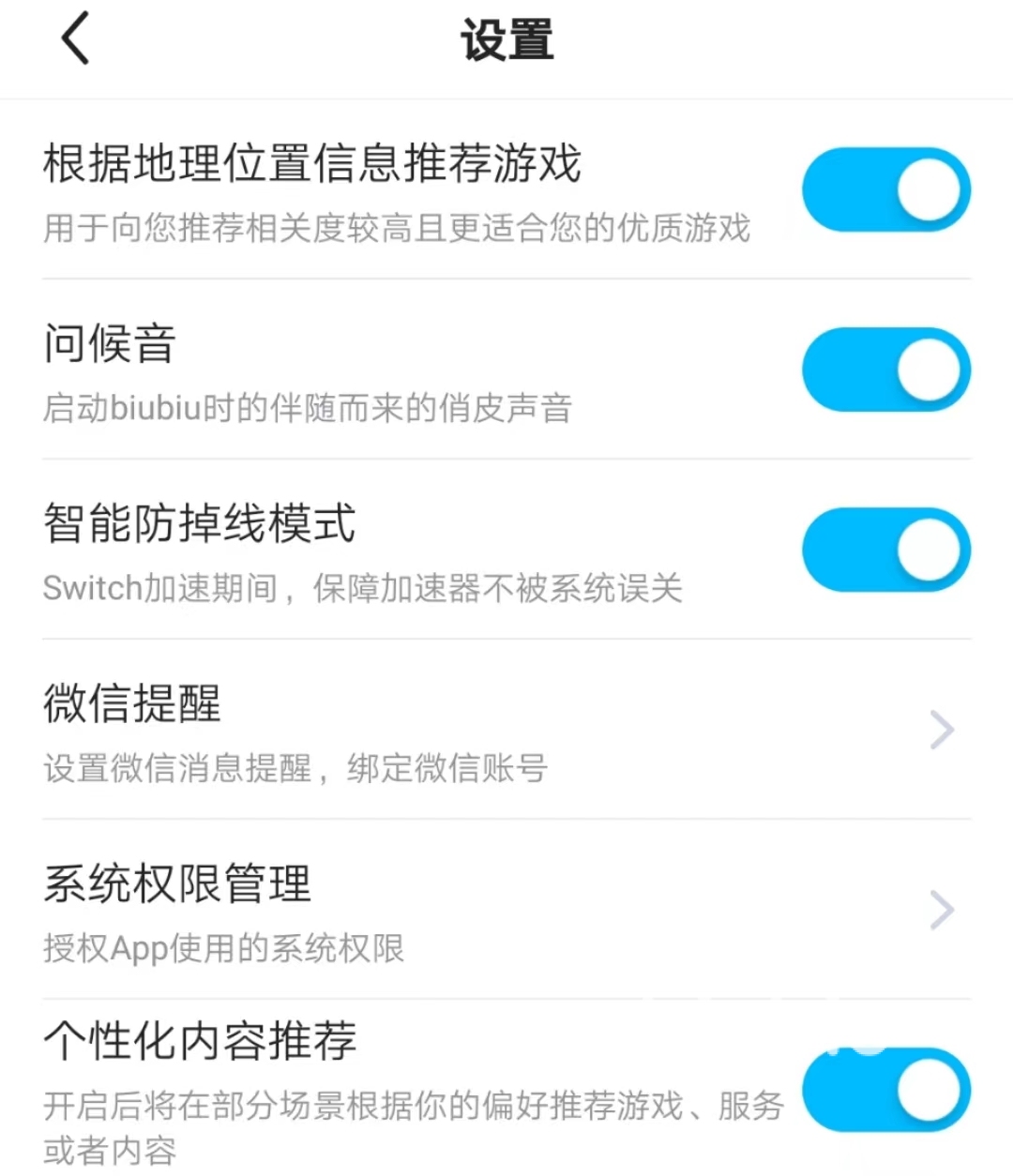 第三步就是調(diào)整參數(shù),參數(shù)的調(diào)整不僅包括加速模式,還有一些個性化的推薦。因為軟件是很人性化的,如果大家開啟根據(jù)地理位置信息推薦游戲的話,那么就能收到系統(tǒng)推薦的一些自己可能感興趣的玩起來也很優(yōu)秀的游戲。