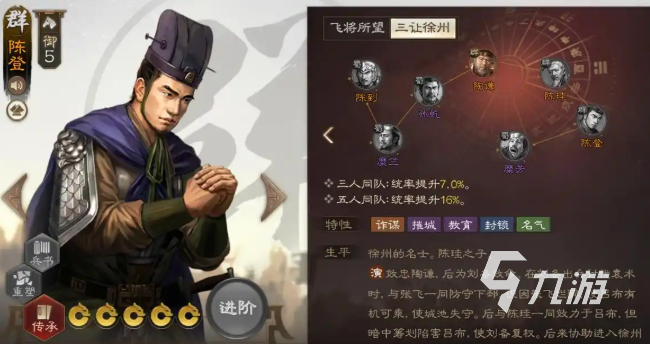 該能力可以為我軍單體恢復(fù)兵力,并使得目標(biāo)的移動(dòng)力加2,持續(xù)一回合,他的羈絆為“三讓徐州”,該羈絆可以和陳登等下圖角色進(jìn)行組隊(duì),三人同隊(duì)可以讓統(tǒng)率提升7%,五人同隊(duì)可以讓統(tǒng)率提升16%,他的特性也比較普通,為支援、詭計(jì)等,沒有橙色特性。
