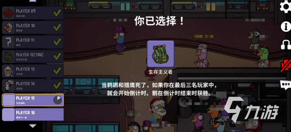 也就是只要倒計(jì)時(shí)一開始,就基本確定了鵝陣營(yíng)的勝利。想要操作好這個(gè)角色,首先大家在每輪當(dāng)中都要比較低調(diào),盡量降低自己的存在感,讓鴨子或者是中立的角色不要注意到自己,要默默的生存到最后,這樣技能發(fā)動(dòng)的可能性才會(huì)提升。