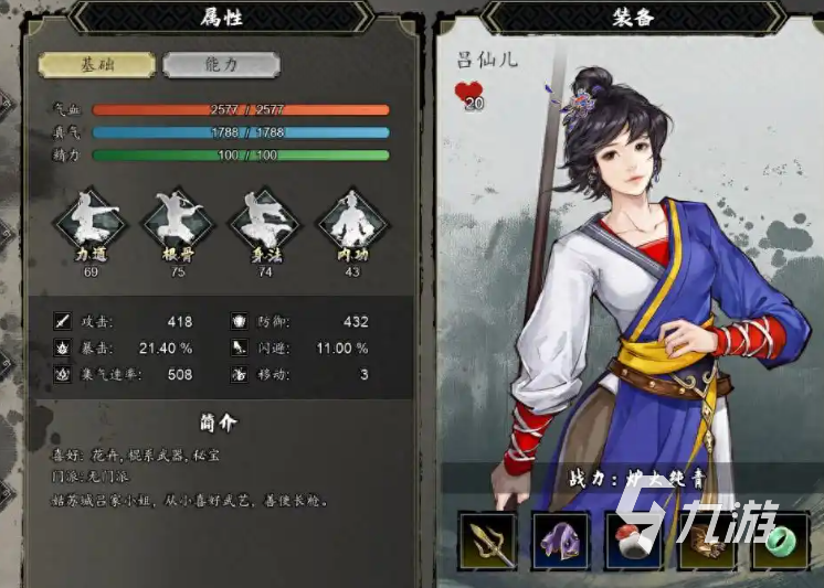 我們會在姑蘇城右邊遇到呂仙兒,此時會展開比武招親劇情,我們選擇出手相助后,前往梧桐村客棧門口對話,選擇略有所聞的選擇,即可邀請入隊,她是一位棍系角色,她的“渾天梨花槍”可以為自身疊加防御,并在攻擊時有50%概率對敵人進行破甲。
