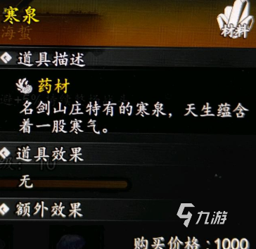 寒泉是比較少見的一個道具,絕大部分玩家聽到這個名字基本上都是出自兩個地方,第一個是寒泉鑄劍這個任務(wù)里面,這也是絕大部分人見到這個道具的渠道。第二個則是收集到的一個菜譜,玩家們在收集到?jīng)霭韬r剡@個菜譜的時候便可以從配方表里面看到是有需要寒泉這個道具的。