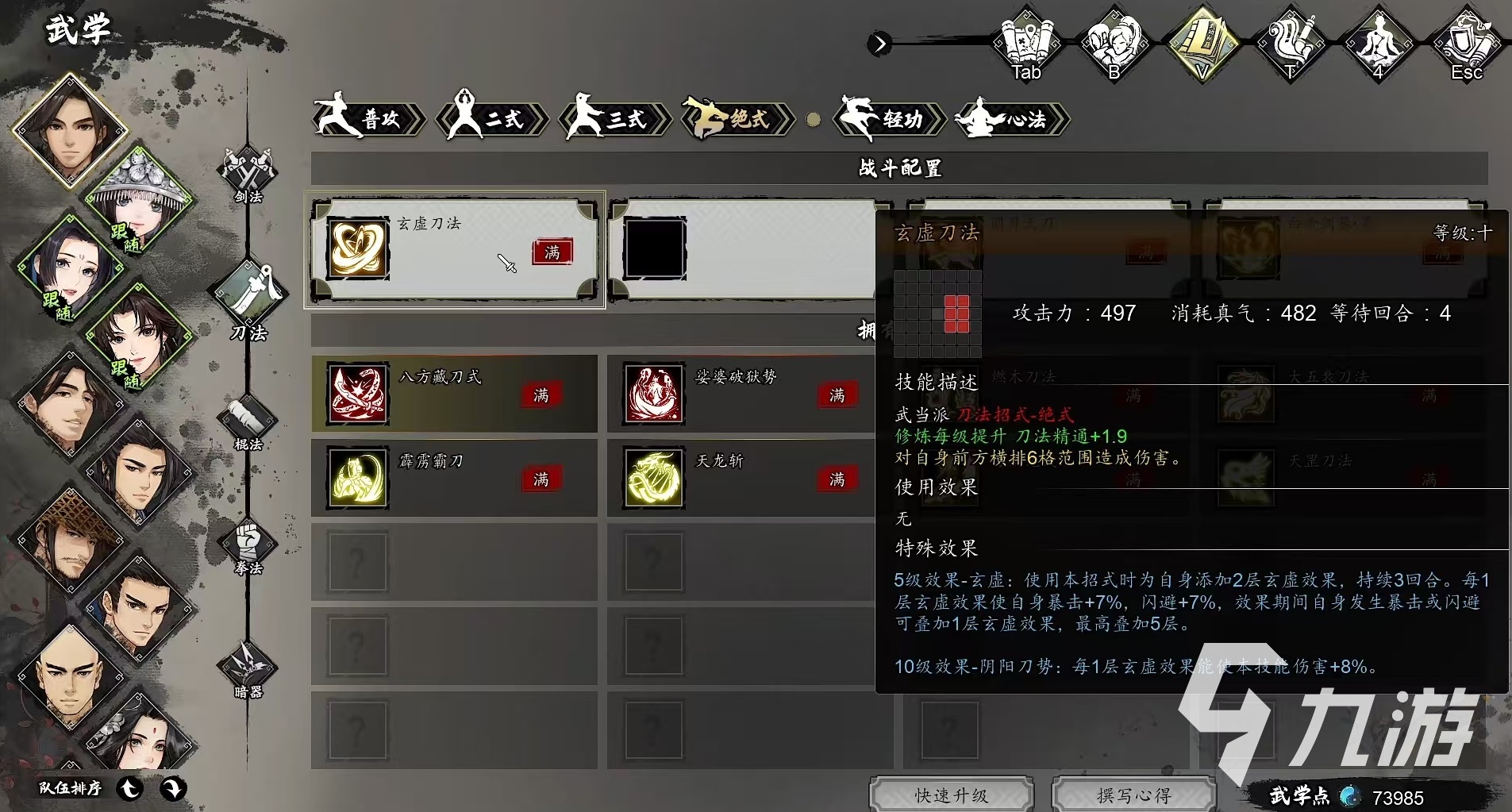 第6個歸元刀法,需要和武當(dāng)派的道微好感度刷到100,然后直接傳授獲得,使用之后可添加一層歸元效果。每層可以使自身受到的傷害一部分由真氣去抵御。第7個狂風(fēng)刀法,通過主線就能得到,是刀系玩法中的主力輸出技能,達(dá)到后期之后基本可以做到刀刀暴擊,集氣速度很快。第8個玄虛刀法,向武當(dāng)派請教后得到,被動效果比較強,提供的暴擊和閃避也是刀系流派中的比選項。