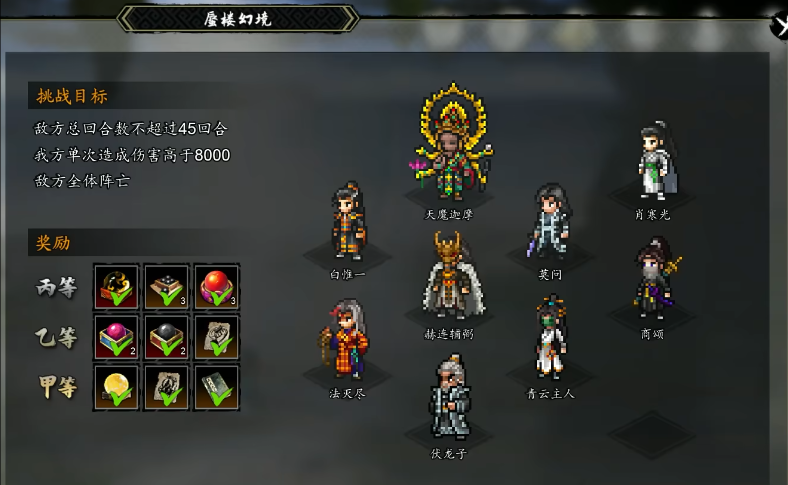 在對戰(zhàn)上玩家要明確本次爬塔對戰(zhàn)的具體boss,比如說難度最高的【天人傳承】中天山父子的高爆發(fā)和青云主人的大招都是傷害非常高的技能,所以在對戰(zhàn)過程中除了要有策略之外也需要一點運氣。建議前排選擇一個坦的角色,盡可能在前面針對天山父子進行輸出,中間的遠程輸出位置擊殺赫連輔弼,想要保險點可以選擇司馬玲這個角色,她有達摩經(jīng)和易筋經(jīng),可以自動復(fù)活2次。這樣度過前期后可以全力對戰(zhàn)赫連,盡可能不讓他有機會放大招。到了后期借助剩余角色的技能來全力進行輸出,盡量選擇帶有恢復(fù)技能的角色為主戰(zhàn)角色。只要能堅持到后期基本上就能成功通關(guān)了。