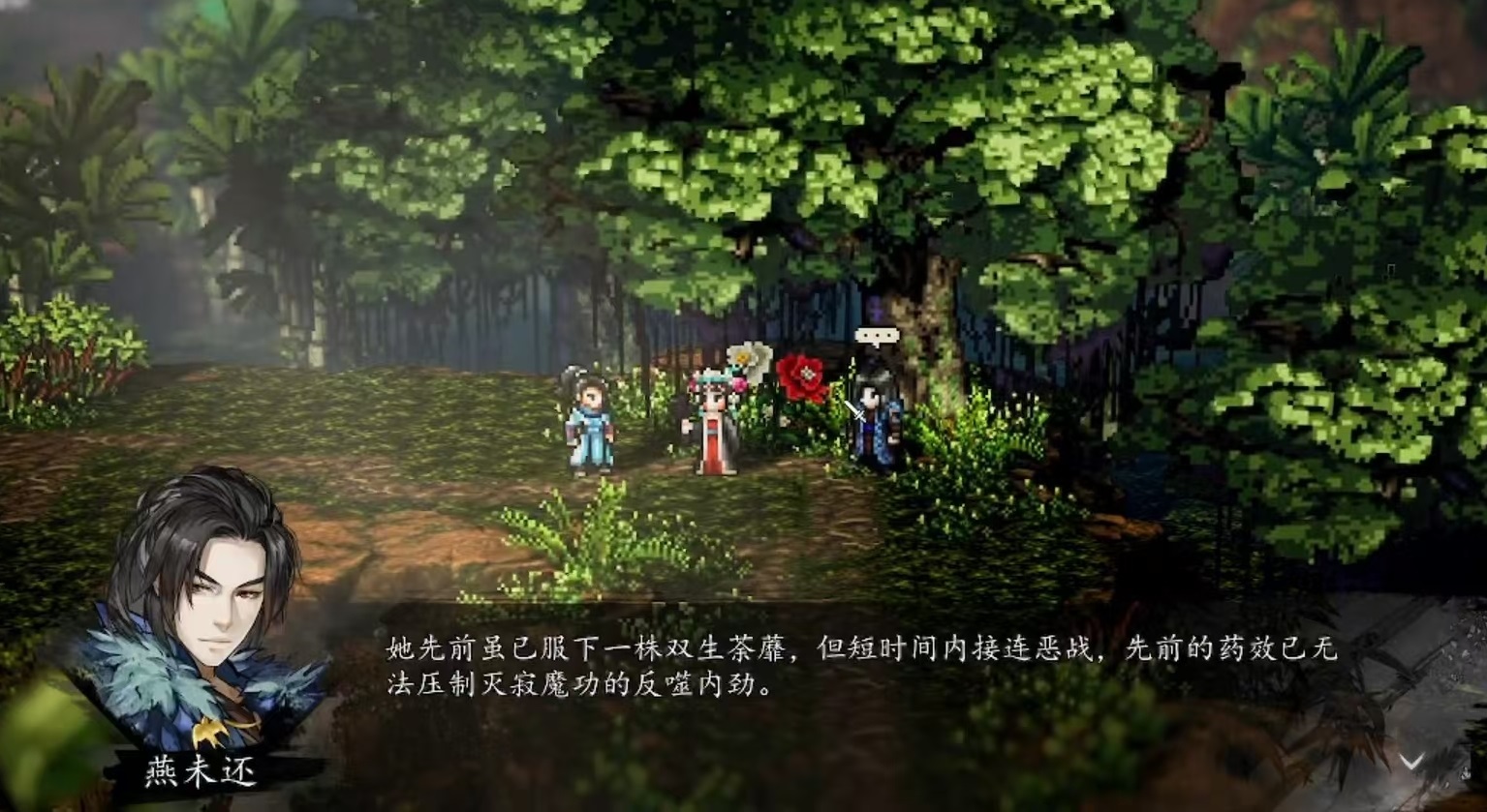 再進入到蔓音林左下角的區(qū)域,觸發(fā)燕未還和荀杳杳之間的隱藏對話,在看完對話之后,要注意燕未還暫時不會加入隊伍,會進入傷魂鳥的后續(xù)任務(wù)線。在后續(xù)劇情中,一定要選擇去勸阻荀杳杳修煉寂滅寂魔攻,這樣可以提升燕未還的好感度。在將整個支線完成之后,再次返回到蔓音林,觸發(fā)最終對話,蔓音林就可以自動入隊了,而且還會解鎖他的專屬掌法飛龍在天。