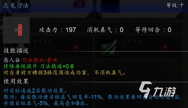 惡人谷刀法的普攻“惡鬼刀法”能對(duì)橫排3格范圍內(nèi)的敵人造成傷害,不消耗真氣,且會(huì)對(duì)目標(biāo)造成2層散功,散功會(huì)讓目標(biāo)的真氣回復(fù)率減少11%,每回合自動(dòng)消散1層,并使得目標(biāo)真氣減少5%,將“惡鬼刀法”修煉到5級(jí)可讓所有惡人谷刀法的招式傷害提升7%。