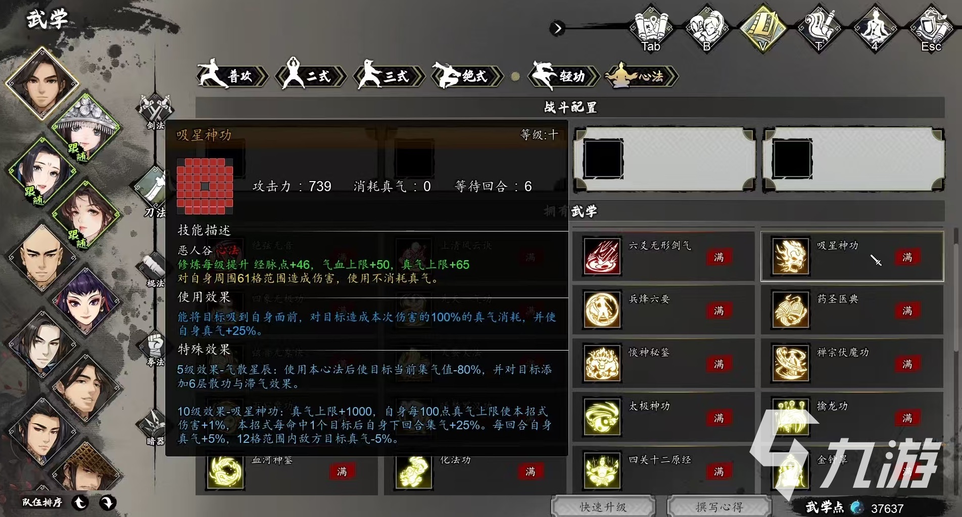 吸星神功升到5層時(shí),觸發(fā)效果氣散星辰,使用吸星神功后目標(biāo)當(dāng)前集氣值大幅度降低,并對(duì)目標(biāo)添加6層散功和滯氣效果,學(xué)到10層時(shí)觸發(fā)效果吸星神功,自身真氣上限加1000,自身每100點(diǎn)真氣上限,可使本招式傷害加1%。在命中一個(gè)目標(biāo)后,自身下回合集氣加25%,每回合真氣加5%,12格范圍內(nèi)敵方目標(biāo)真氣降低5%。能夠提升己方續(xù)航,大大削弱對(duì)方的輸出能力,是吸星神功最大的優(yōu)勢(shì),強(qiáng)行集體抽籃和降低對(duì)方的集氣都削弱了節(jié)奏。