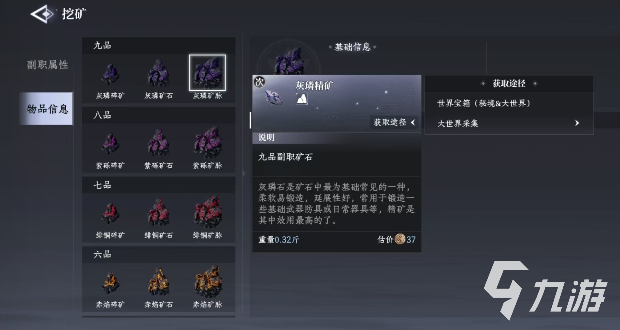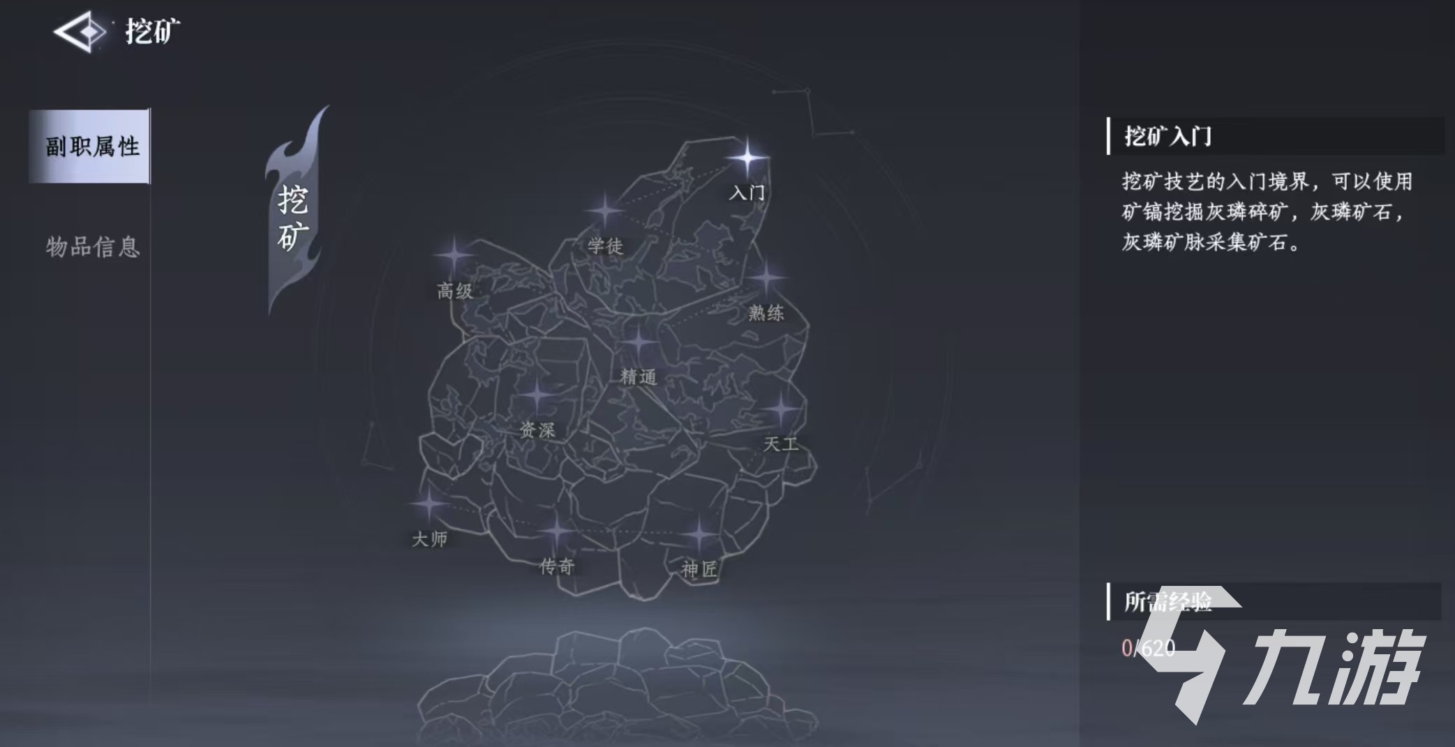 挖礦是屬于游戲副職業(yè)之一,但是要注意要想挖礦并不需要學(xué)習(xí),因?yàn)槊總€(gè)角色的所有副職業(yè)都是全部開放的,只是在最初的階段,所有職業(yè)都是屬于最初的入門級(jí)。大家點(diǎn)開副職業(yè)之后,選擇采集,就可以看到挖礦的選項(xiàng)。點(diǎn)擊挖礦之后可以看到自己當(dāng)前的挖礦等級(jí)以及相應(yīng)的物品信息。在最初的時(shí)候,只能使用簡單的工具去挖掘灰磷礦脈,采集到最基礎(chǔ)的灰磷礦石。