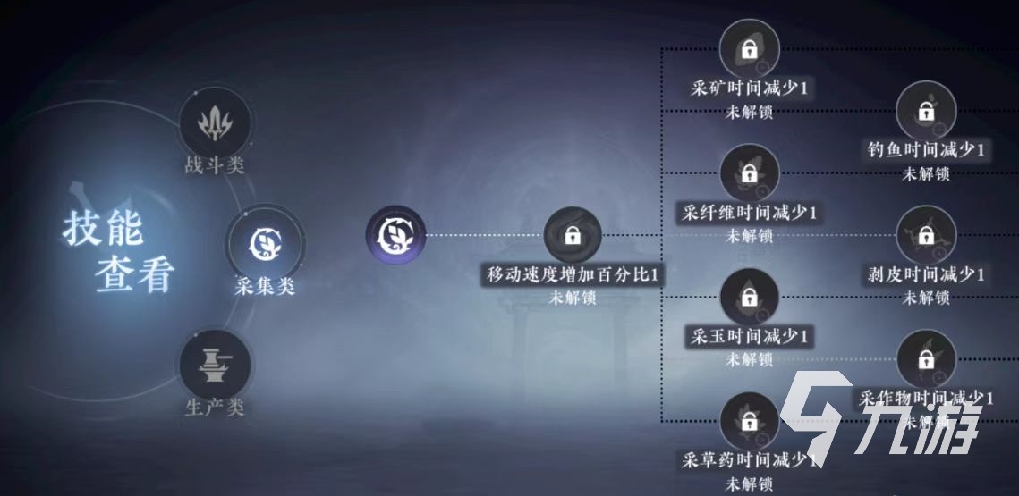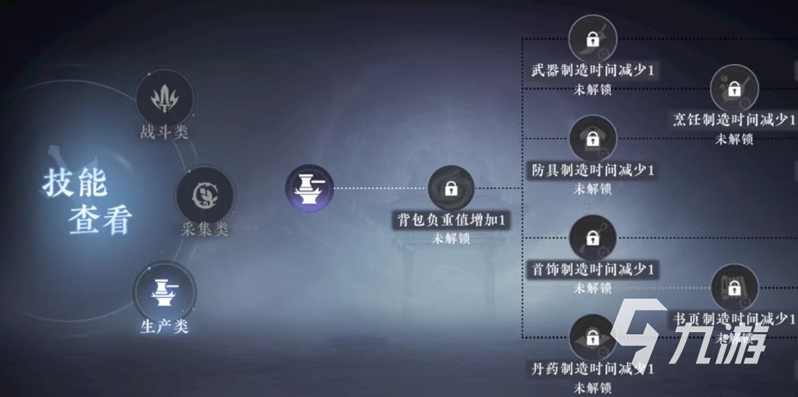 采集類也是如此,但主要增加的是和采集相關(guān)的技能,例如移動(dòng)速度增加,采礦時(shí)間減少,采纖維時(shí)間減少,采玉時(shí)間減少等。學(xué)習(xí)了這些采集類技能,就可以在更短時(shí)間內(nèi)獲得資源。最后是生產(chǎn)類,生產(chǎn)指的是將采集獲取到的資源,加工成裝備或道具。主要增加的是背包負(fù)重值,武器制造時(shí)間減少,防具制造時(shí)間減少,首飾制造時(shí)間減少等。
