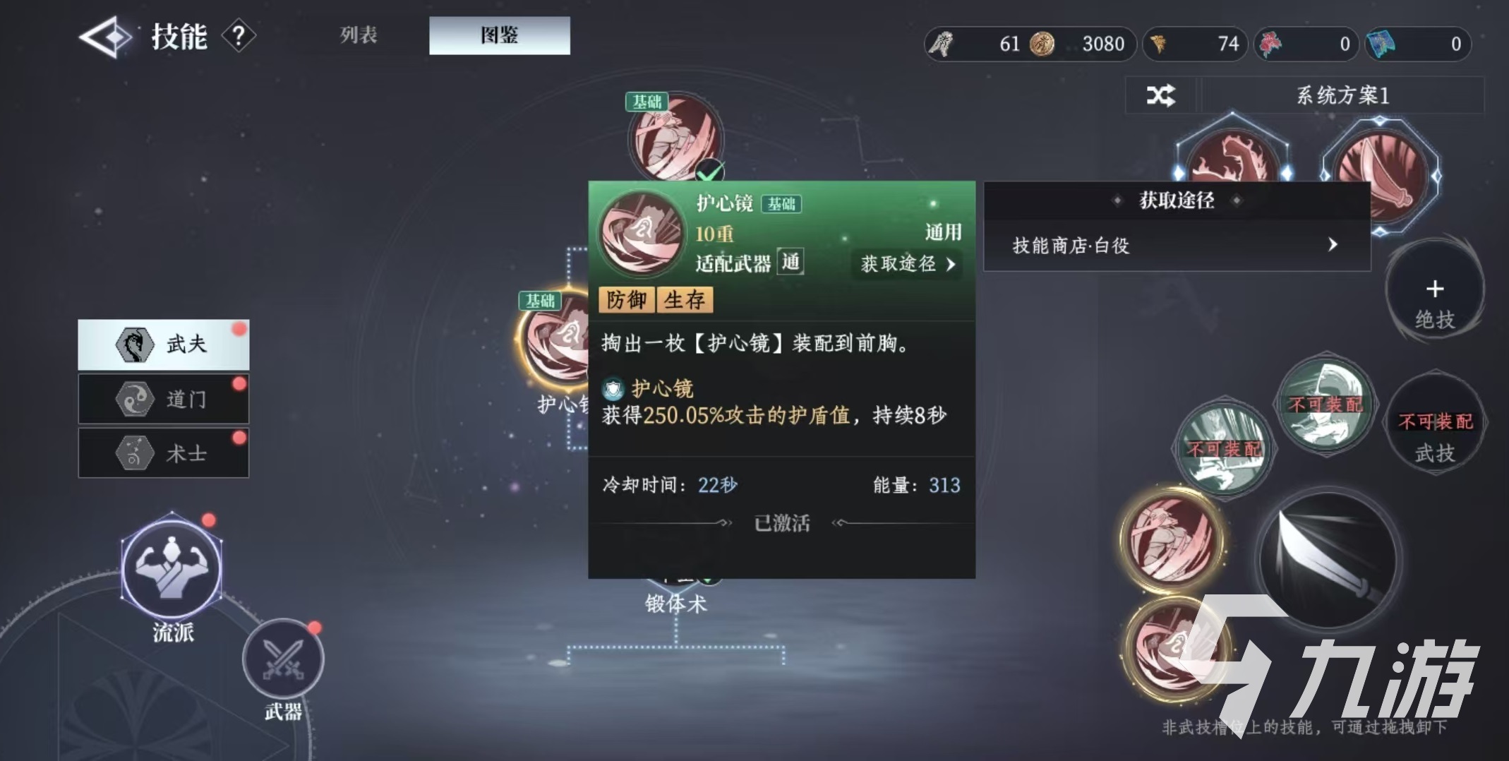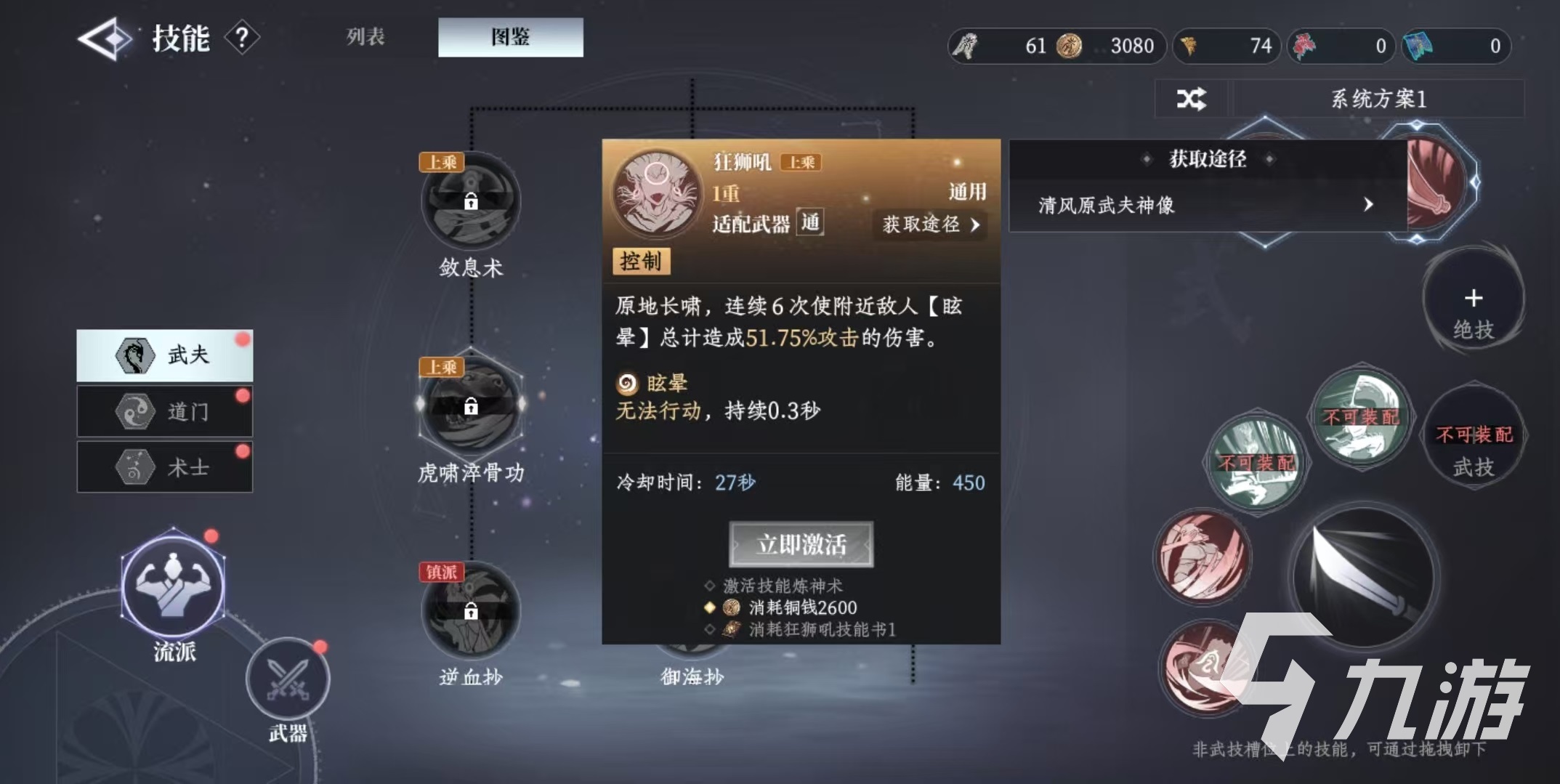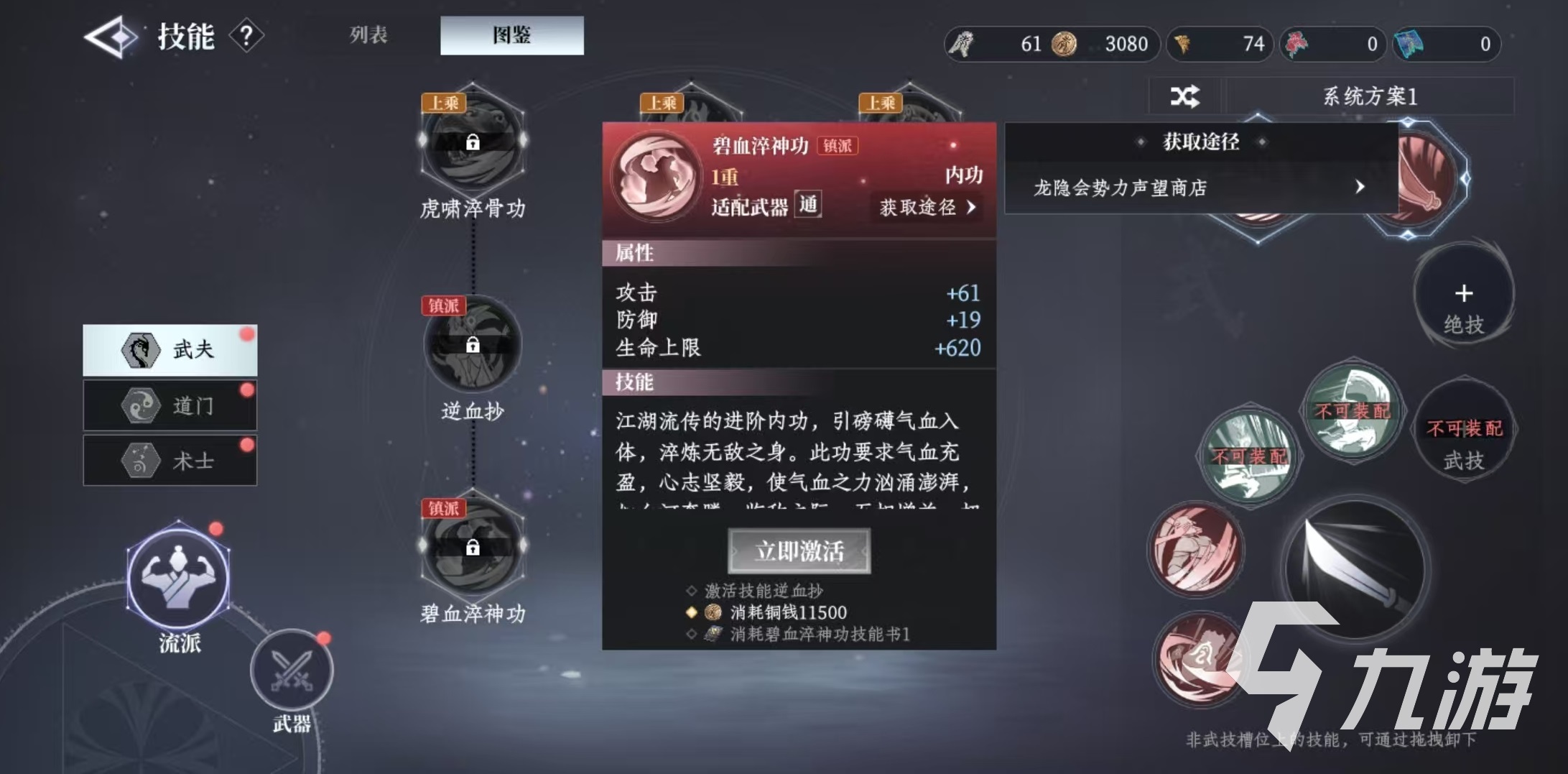 大家在游戲的功能頁(yè)面中打開技能之后可以看到有當(dāng)前的三個(gè)不同流派,分別是武夫、道門和術(shù)士,每個(gè)流派都有一系列技能。從基礎(chǔ)技能到入門技能以及后續(xù)的進(jìn)階、上乘、鎮(zhèn)派等,都有著多個(gè)不同的選項(xiàng)。要想學(xué)會(huì)這些技能,必須要找到對(duì)應(yīng)的技能書。不同類型的技能獲取方式就有所區(qū)別,先看一下三個(gè)流派的基礎(chǔ)技能,除了在對(duì)應(yīng)的神像處就可以直接得到之外,還有一些是需要在技能商人那里購(gòu)買獲得。
