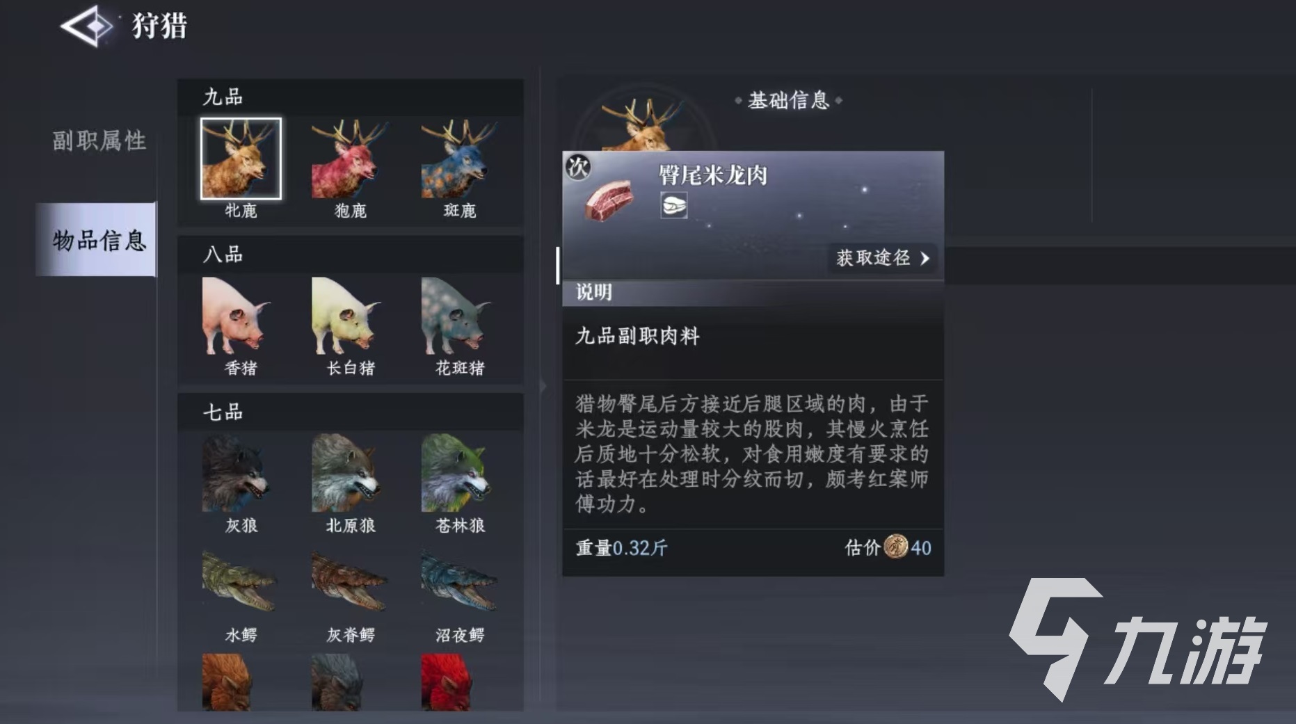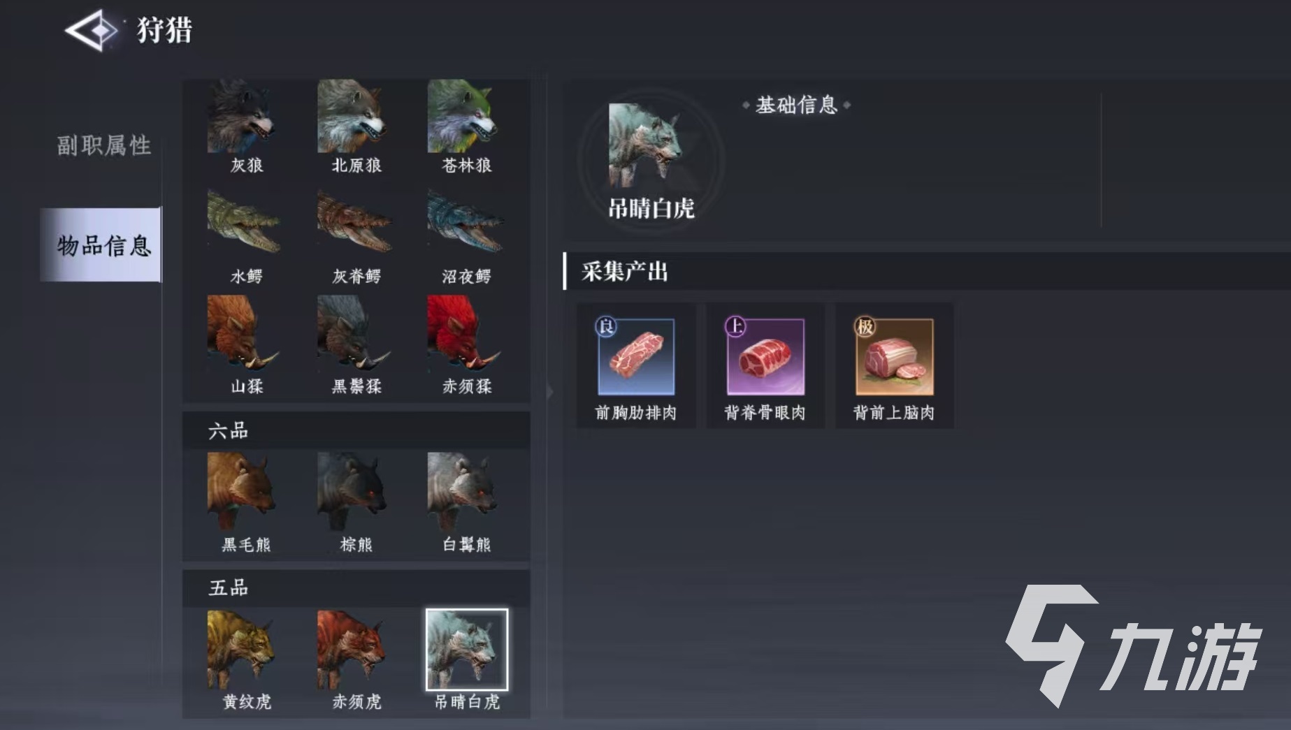 狩獵所獲取到的收益也是從九品開始,一直到最高的五品。其中九品主要產(chǎn)出的是臀圍米龍肉,八品產(chǎn)出的是里脊嫩尖肉,七品產(chǎn)出的是前胸肋排肉,六品產(chǎn)出背脊骨眼肉,五品產(chǎn)出背前上腦肉等。需要大家找到對應(yīng)的獵場,才可以獲得高品級的收益。而且每一次狩獵也不是完全能夠產(chǎn)出高品,也有一定的幾率產(chǎn)出低品質(zhì),所以也是比較看臉的一項操作。