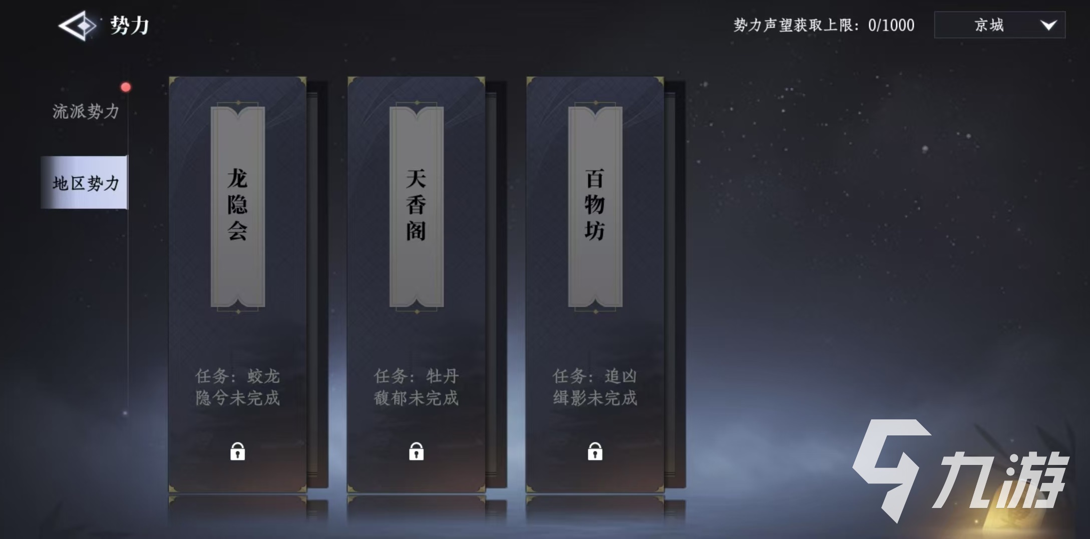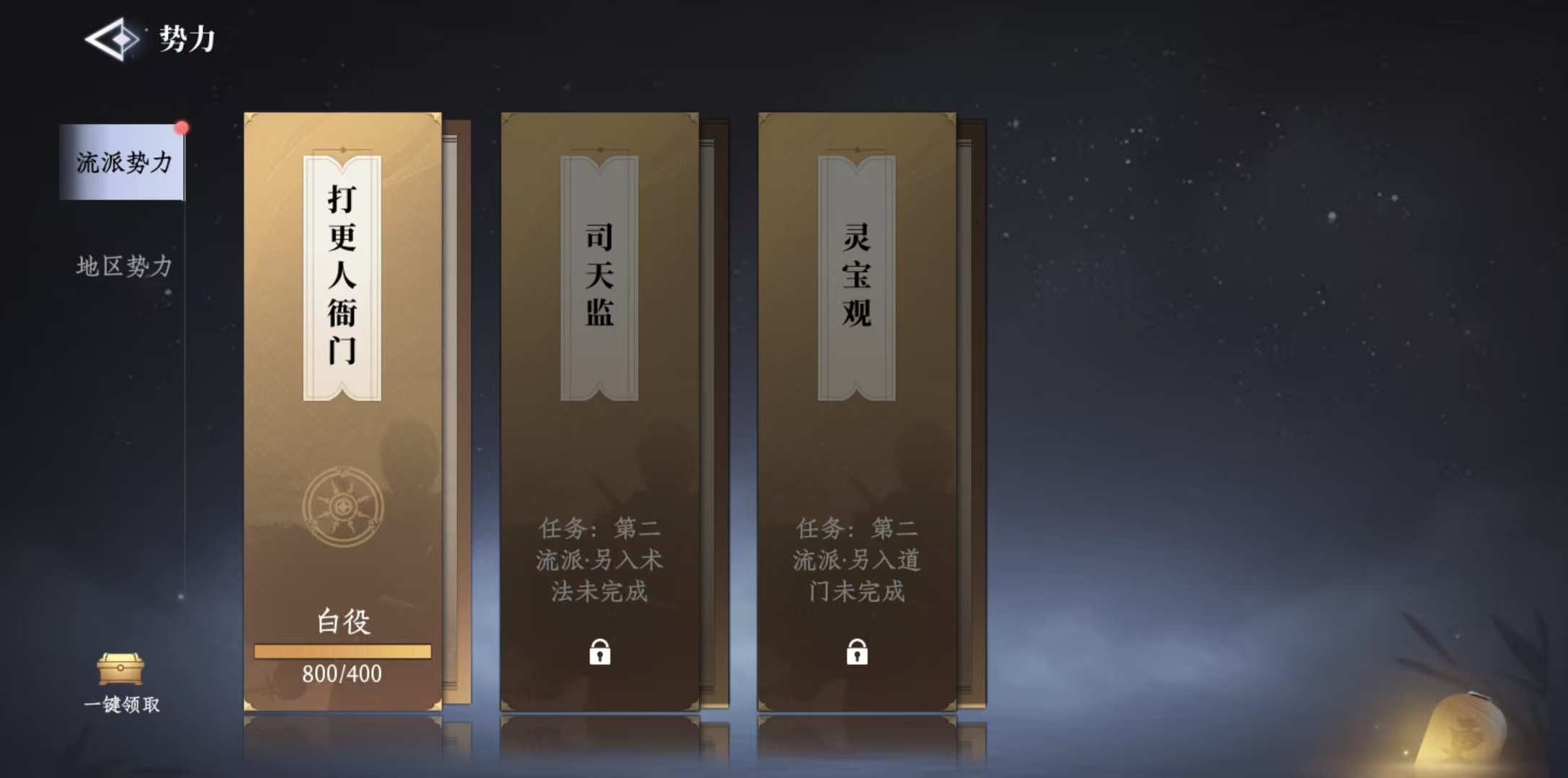玩家在游戲前期跟隨主線,就可以逐漸接觸游戲中的這些勢力,在功能菜單中可以直接看到當前的勢力列表和類型。游戲中的勢力又分為流派勢力和地區(qū)勢力這兩類。流派勢力主要包括打更人衙門、司天監(jiān)和靈寶觀,這三個都是大家非常熟悉的。地區(qū)勢力則是根據(jù)解鎖地圖的范圍不斷增加,在前期階段主要包括龍隱會、天香閣和百物坊。