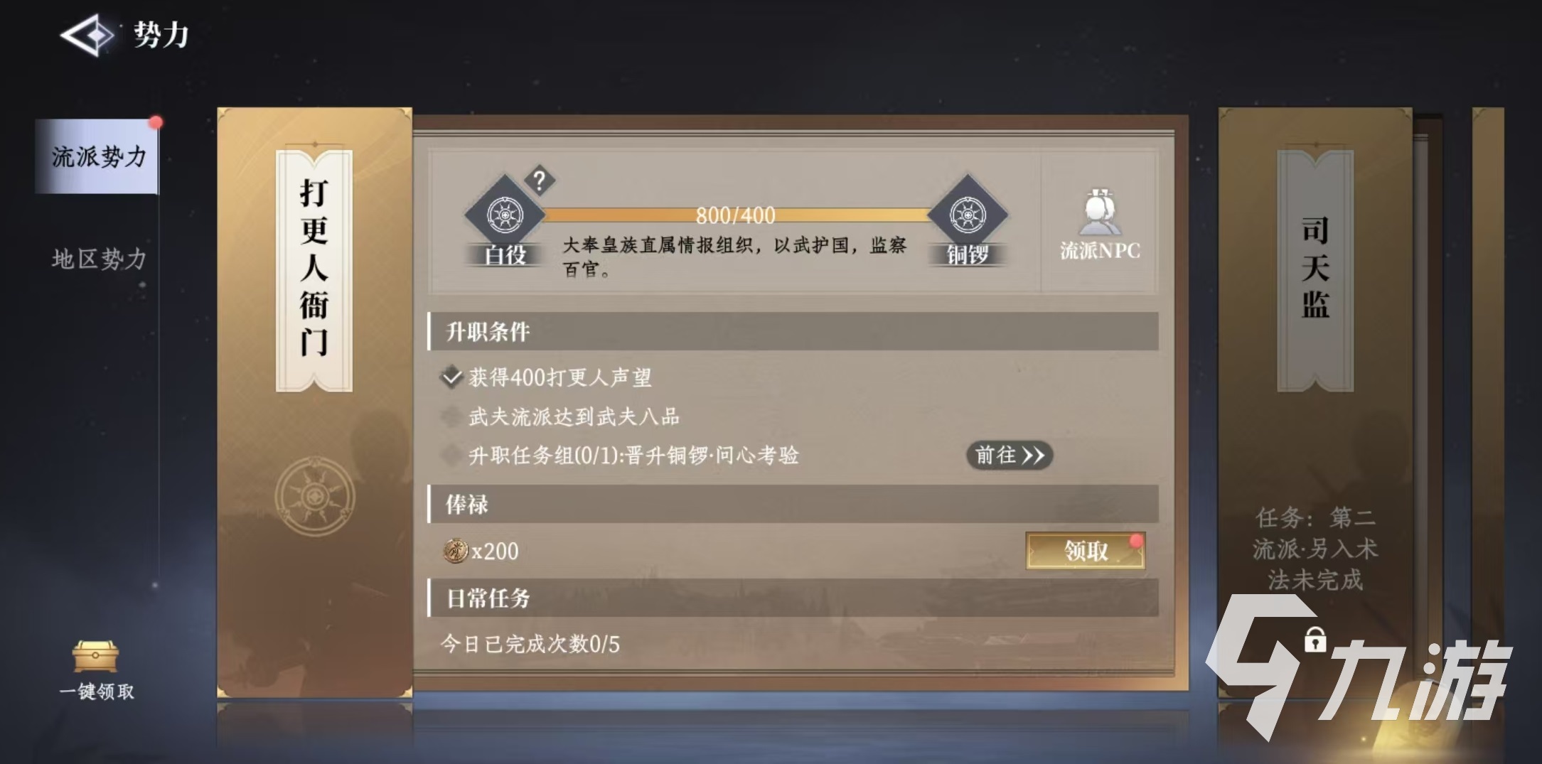 在前期玩家加入的第1個勢力就是打更人衙門,在完成了任務第二流派另入術(shù)法之后,可以加入到司天監(jiān)。完成任務,第二流派另入道門之后,可以加入靈寶觀。地區(qū)勢力也有自己對應的加入任務,例如龍隱會需要完成任務蛟龍隱兮,天香閣需要完成任務牡丹馥郁,百物坊需要完成任務追兇緝影。流派勢力和地區(qū)勢力對應的玩法和獎勵是不同的,流派勢力以打更人衙門為例,每天可以完成對應的日常,然后不斷累積貢獻晉升。玩家一開始是屬于白役,后續(xù)可以升到銅鑼。然后在流派npc這里可以學習到技能,在商人處進行道具兌換等。只要達到要求就可以晉升,每天還可以領(lǐng)取到俸祿。