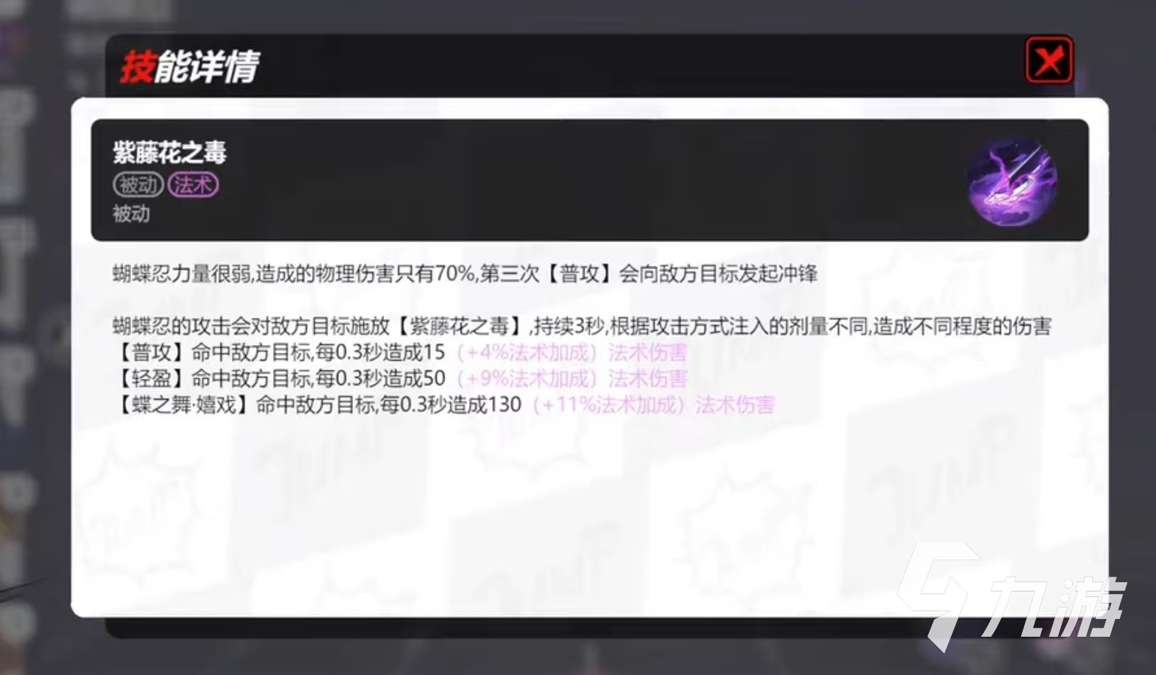 蝴蝶忍在游戲中的定位是刺客型,法師這就要求大家必須熟練使用連招才能發(fā)揮優(yōu)勢(shì)。被動(dòng)紫藤花之毒,蝴蝶忍造成的物理傷害只有70%,但第3次普攻,會(huì)向敵方目標(biāo)發(fā)動(dòng)沖鋒。在攻擊時(shí),會(huì)對(duì)目標(biāo)釋放紫藤花之毒,持續(xù)三秒鐘。根據(jù)不同的攻擊方式,注入不同的劑量,造成不同程度的傷害,主要分為普攻、輕盈和蝶之舞這三種。