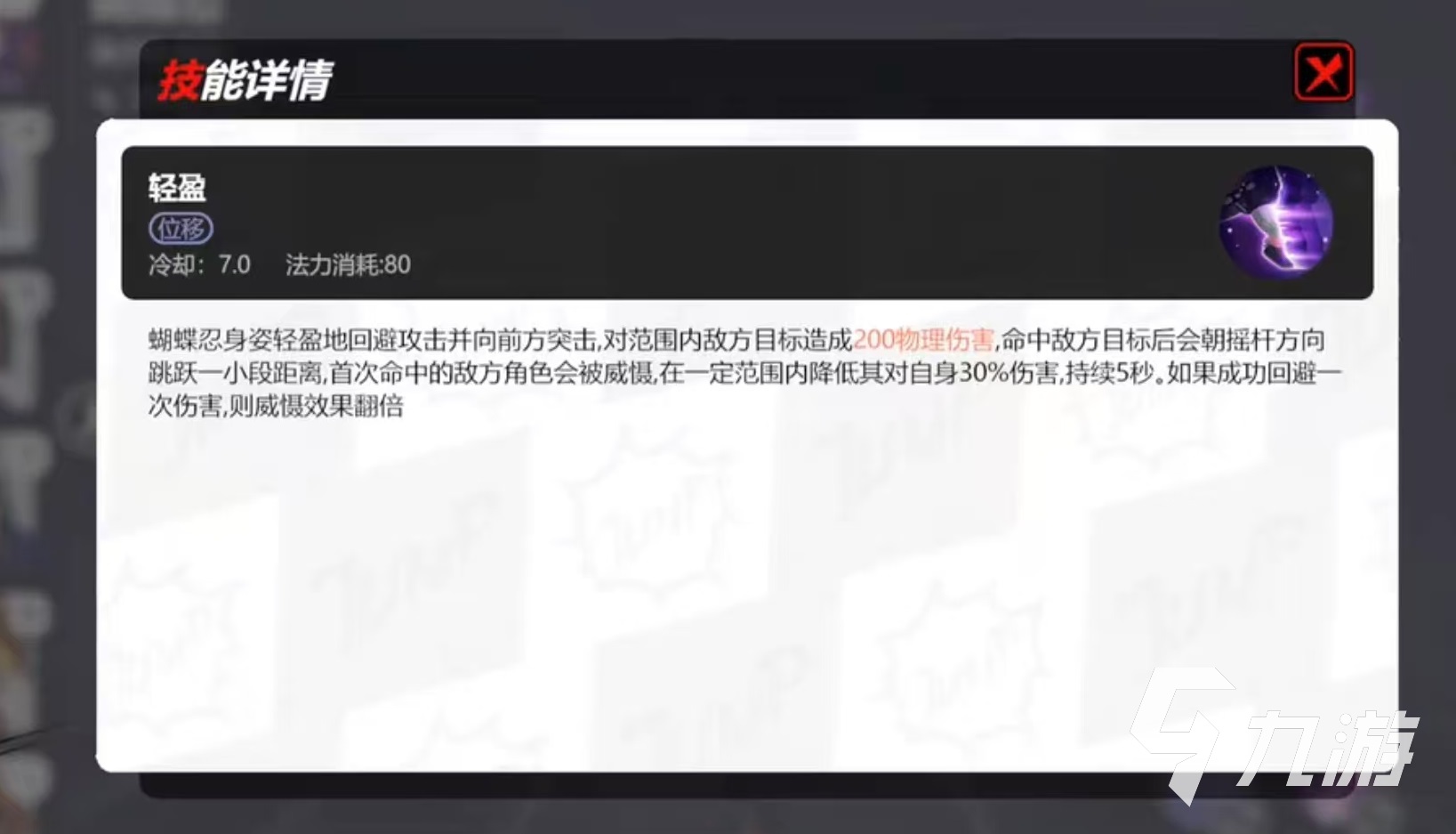 第1個(gè)技能輕盈,可直接回避攻擊并向前方突擊,造成范圍傷害,命中敵方目標(biāo)后會(huì)朝搖桿方向再跳躍一段距離。首次命中的敵方角色會(huì)被威懾,被威懾之后,能降低其對(duì)自身的傷害,持續(xù)5秒鐘。如果此技能成功回避一次傷害,則威懾效果翻倍,該技能既有位移效果又有控制和傷害,是蝴蝶忍的核心技能。而且要利用好和被動(dòng)的聯(lián)動(dòng),利用輕盈去注入劑量,打出比普攻更高的傷害。