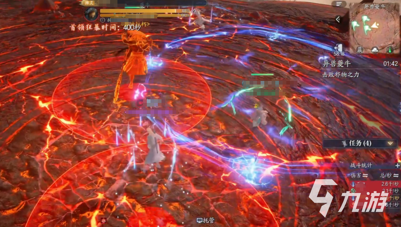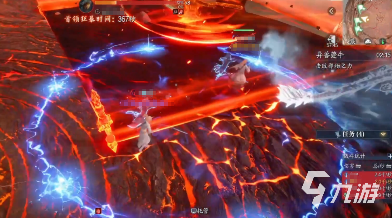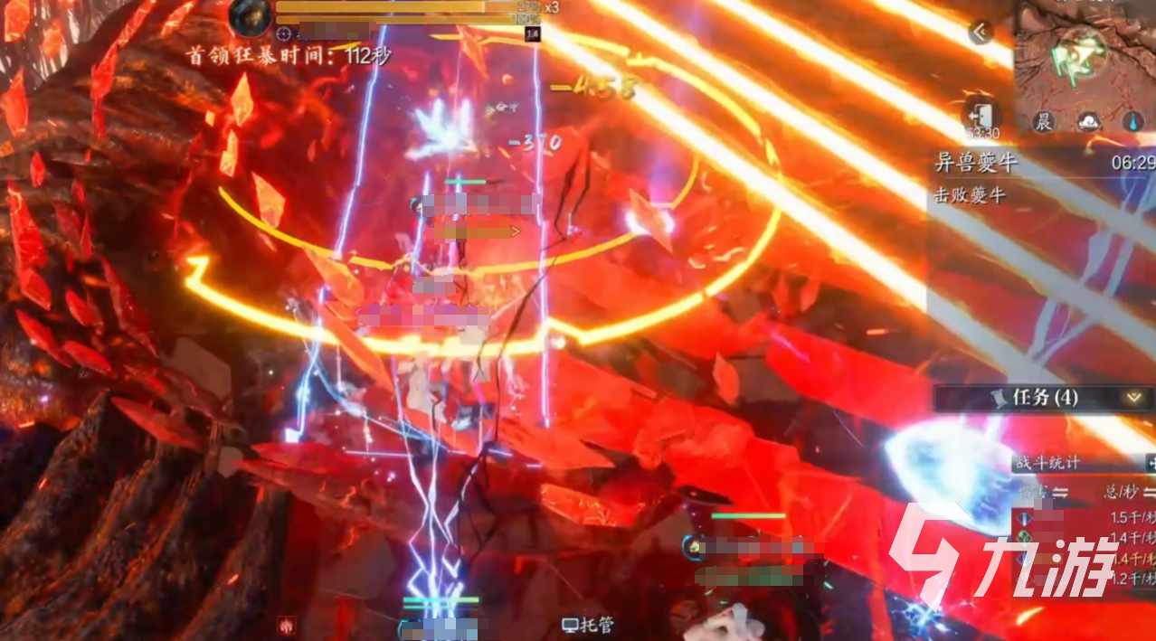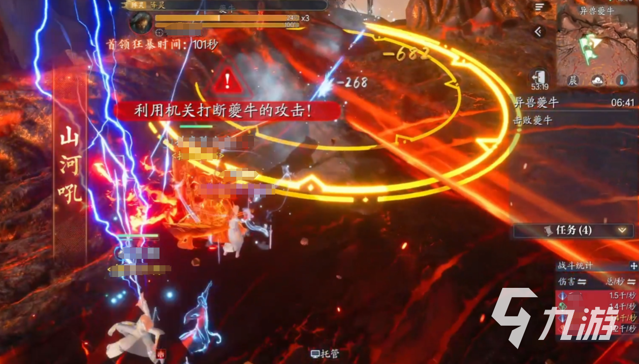 夔牛處于第一階段(100%-80%血量)時,可以釋放激光紅圈:BOSS腳下生成激光和密集紅圈,需分散躲避。另外還會生成黑洞立場:石頭瞬移至隨機玩家身邊形成黑洞,需解控逃離。接著80%血觸發(fā)隕石機制,隨機點名2名玩家,需集合在牛頭前讓隕石落在一起。這時需要神祝(治療職業(yè))使用特殊技能4?將隕石推向BOSS,使其進入虛弱狀態(tài)。