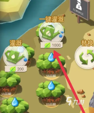 在這個(gè)菜單里,可以清晰地看到包括一級灌溉和替換以及灌溉在內(nèi)的多種不同選項(xiàng)。當(dāng)綠色能源儲備充足時(shí),玩家可以依據(jù)當(dāng)前需要澆灌的樹木數(shù)量,來選擇使用一鍵澆灌功能。此時(shí),所需的綠色能源數(shù)量會隨著樹木數(shù)量的不同而自動調(diào)整。
