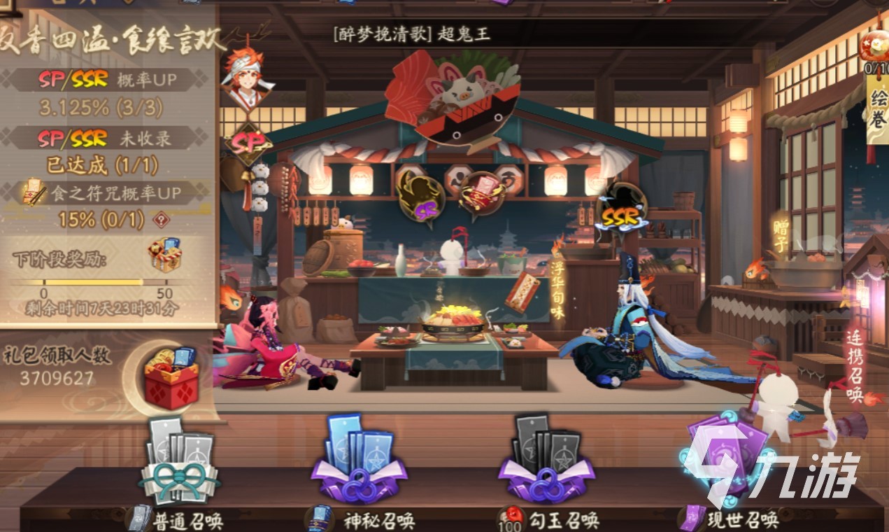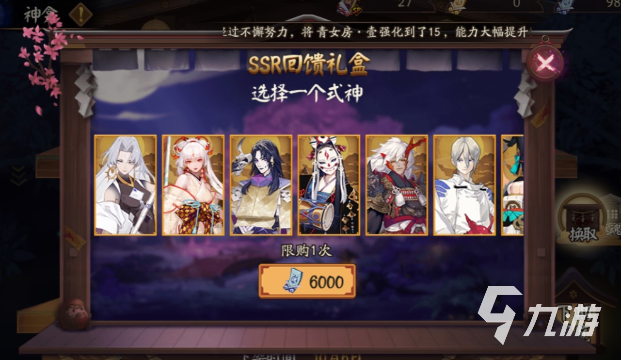 4.SSR重臨神龕,這次不再是神龕六君子,終于他們新添了幾名成員,除了之前的小鹿男、茨木童子、大天狗、妖刀姬、花鳥(niǎo)卷、青行燈、一目連、閻魔,有加了八岐大蛇、不知火、瀧夜叉姬和玉藻前。使用6000御札即可兌換,期間只能兌換一次。