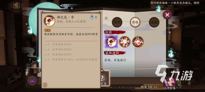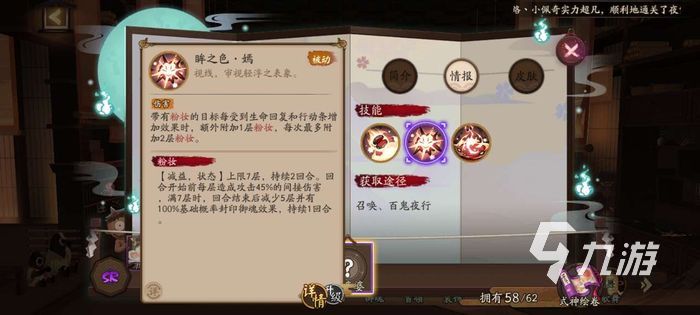 這個式神的面板可以說是比較一般的,只有121的初始速度比較不錯。1技能的效果是造成傷害,然后可以附加粉妝的buff效果。