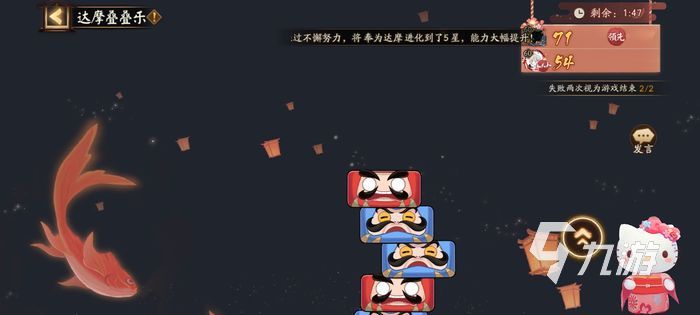 此外游戲內(nèi)失敗的條件有兩個(gè),第一個(gè)是放置的時(shí)候放歪了,大家只要歪兩次游戲就算失敗,所以還是非常看大家的游戲熟練度。第二個(gè)條件是大家堆積的達(dá)摩歪的有點(diǎn)離譜,這個(gè)時(shí)候如果繼續(xù)放上去就算失敗。