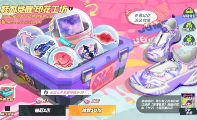 這次七夕活動(dòng)最受關(guān)注的莫過于“鞋力覺醒·印花工坊”限時(shí)玩法。玩家可以通過使用印花解碼蛋進(jìn)行抽獎(jiǎng),最多20抽必得七夕主題印花。更新一口氣帶來了六款全新七夕印花,包括浪漫星空、愛心喜鵲、紅繩、流星等,充滿了象征愛情與美好寓意的元素。