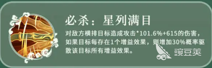 大家使用徐庶的話他普攻技能上面就可以進(jìn)行點(diǎn)殺,而且必殺技也算作是一個大范圍攻擊的大招,在大范圍攻擊之后還可以產(chǎn)生一定的影響來施加給敵人,所以他可以給敵人造成中毒狀態(tài)的情況下帶來的大范圍輸出,就是徐庶最大的輸出特點(diǎn),他的優(yōu)勢就是可以驅(qū)散對方以及限制對方的一些增益效果,那么在技能上面,他的必殺技叫做星列滿目,這個技能可以對敵方橫排的目標(biāo)全部造成攻擊,選擇一個橫排對其中的所有目標(biāo)造成的攻擊百分比達(dá)到101%,當(dāng)然此時帶來的固定點(diǎn)還有615的固定數(shù)值傷害,如果目標(biāo)此時身上還有增益狀態(tài)的話,使用這個技能迅速進(jìn)行攻擊,還會增加30%的概率,可以驅(qū)散敵人身上的增益效果。