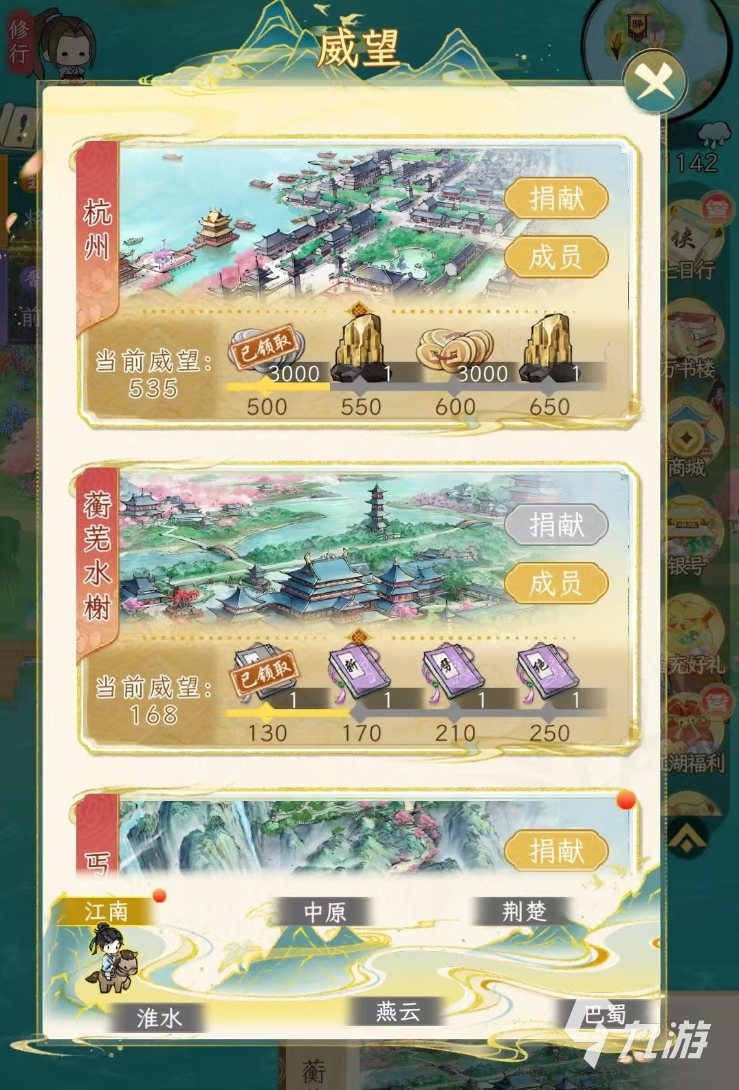 在華夏千秋中,威望分為兩類,分別指的是城市威望和對應(yīng)門派的威望,這兩種威望在獲取方面比較相似,絕大多數(shù)都是通過捐獻的方式來刷。先來看一下城市威望,玩家在游戲中跟隨主線會解鎖很多城市,例如江南有杭州、建業(yè)、景德鎮(zhèn)、姑蘇、上饒等,其他還有中原、荊楚地區(qū)都有對應(yīng)的城市,這些城市也都有自身對應(yīng)的威望值,想要獲得這些城市的威望通過捐獻就能夠達成。