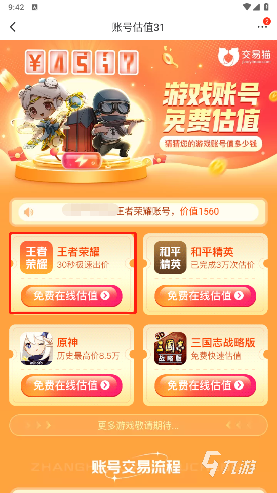 這個(gè)軟件就是交易貓,該平臺目前支持四款游戲的賬號估值,而“王者榮耀”就屬于其中之一。該游戲里的玩法就是MOBA模式下的5v5英雄對決,而能夠花錢的地方都在買英雄和皮膚上面,它們的數(shù)量都非常多,所以想全部集齊的話需要消耗不少點(diǎn)券。
