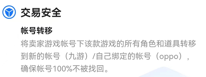 交易貓會為我們提供多種服務(wù),在購買賬號的過程中,玩家們可以選擇賬號轉(zhuǎn)移服務(wù),部分渠道號是可以直接進(jìn)行轉(zhuǎn)移的,將賣家的賬號資源轉(zhuǎn)移到自己的九游或者其他渠道號下面,這樣后期保障也會更全面,能最大限度避免賬號被找回的風(fēng)險。