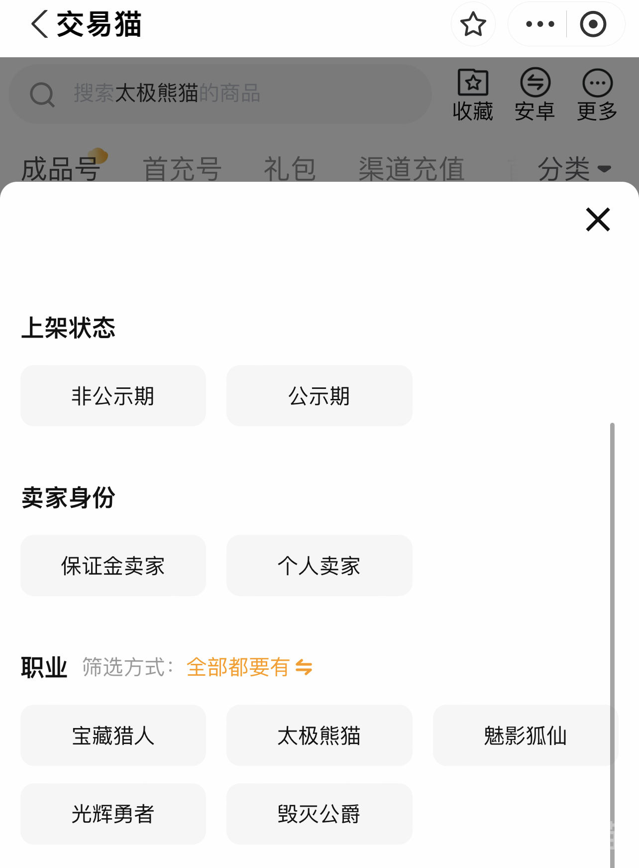 有的玩家只希望玩某個角色,所以就需要買對賬號,不然買錯了也白搭。在交易貓里可以在篩選欄目里挑選一個自己最愛的職業(yè),例如太極熊貓、毀滅公爵又或者寶藏獵人。這樣就能滿足你的愛好,也能更精準地找到擁有這個職業(yè)的賬號,節(jié)省時間。