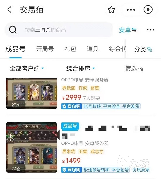 首先,點(diǎn)擊上方鏈接下載交易貓,注冊(cè)登錄后,在搜索框中輸入我們的關(guān)鍵詞“三國(guó)殺成品號(hào)”,然后就會(huì)出現(xiàn)各個(gè)等級(jí),各種服務(wù)的的三國(guó)殺成品號(hào)。等級(jí)高的賬號(hào)當(dāng)然售價(jià)也會(huì)高,這個(gè)大家肯定了解,那小編就給大家說(shuō)說(shuō)平臺(tái)提供的服務(wù)吧。