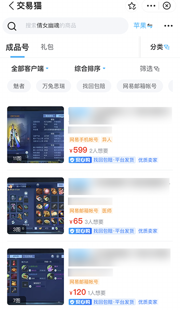 來源: 極光 作者: 檸檬 2023年03月13日 21:22伴隨游戲交易市場(chǎng)火爆,一大批小平臺(tái)和論壇如雨后春筍般誕生。只是它們運(yùn)作不規(guī)范,玩家們?nèi)菀妆豢?,要不丟失賬號(hào),要不損失金錢。下面小編帶來新倩女幽魂買號(hào)攻略說明。通過交易貓購(gòu)買新倩女幽魂賬號(hào),玩家們不必?fù)?dān)心被找回,交易安全險(xiǎn)提供賬號(hào)丟失全額理賠。