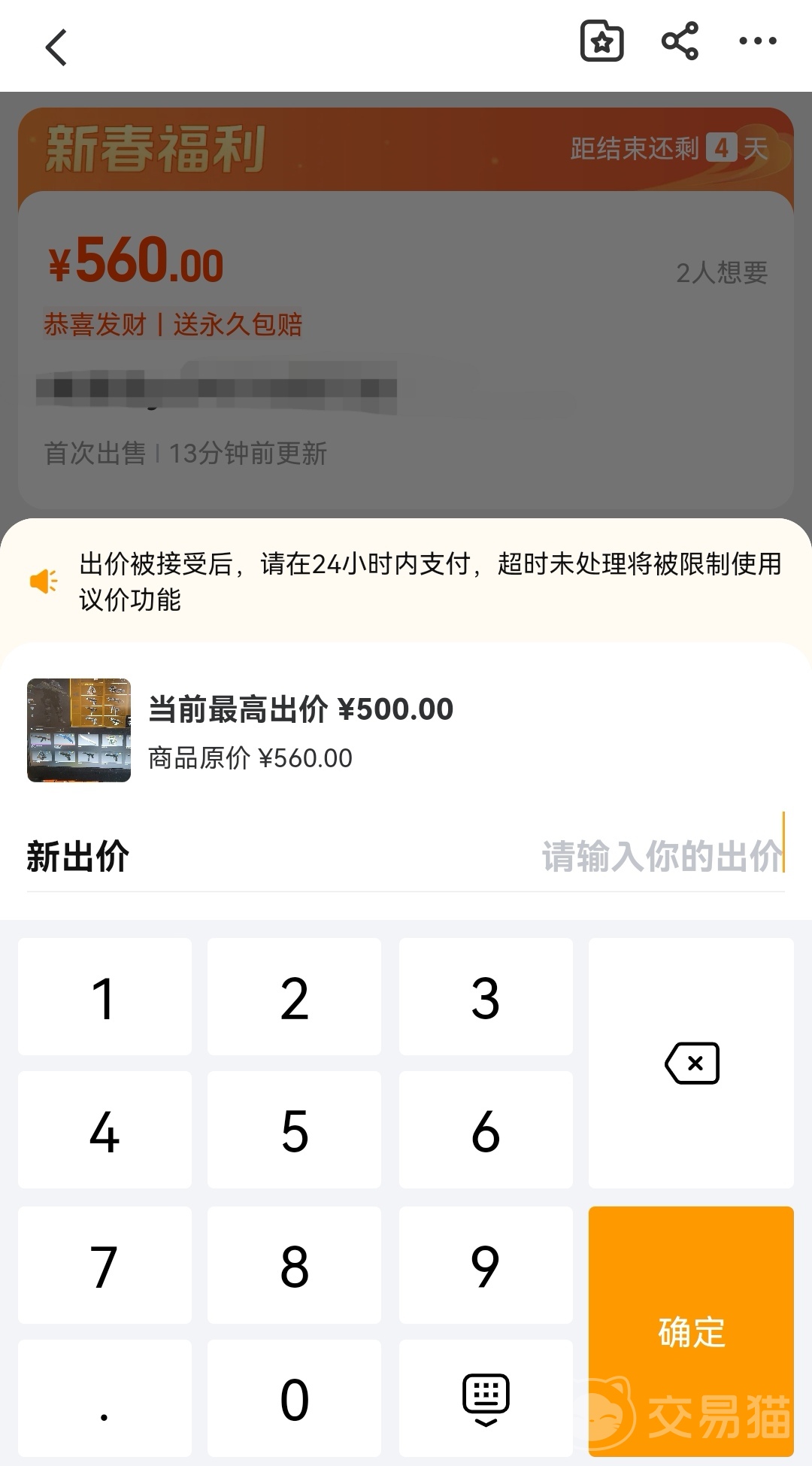 還有就是大家在瀏覽各個(gè)賬號(hào)鏈接時(shí)會(huì)發(fā)現(xiàn)你心儀的賬號(hào)價(jià)格超出了你的預(yù)算,那你就可以通過(guò)詳細(xì)信息頁(yè)面下方的議價(jià)與賣(mài)家溝通,一般情況下有標(biāo)價(jià)和當(dāng)前最高價(jià),比如下方圖片當(dāng)中的賬號(hào)標(biāo)價(jià)為560,當(dāng)前最高出售價(jià)500,我這兩個(gè)價(jià)格都不在你預(yù)算范圍內(nèi)的話就可以給一個(gè)新出價(jià),如果賣(mài)家沒(méi)有任何問(wèn)題的話你就可以直接下單購(gòu)買(mǎi)了,如果還不同意的話就要與商家繼續(xù)溝通一下了。