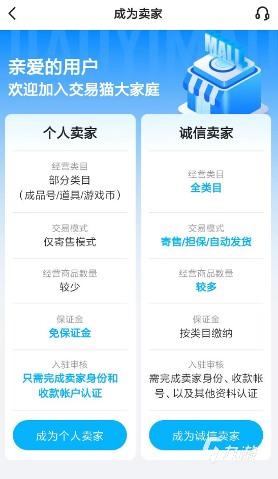 1、玩家正式的在交易貓app當(dāng)中開始出售游戲賬號之前,大家記得先去申請獲得一個賣家的身份。如果各位只出售游戲號一類的商品,建議直接開通個人賣家身份。該身份的申請流程非常簡單,適合大部分玩家。