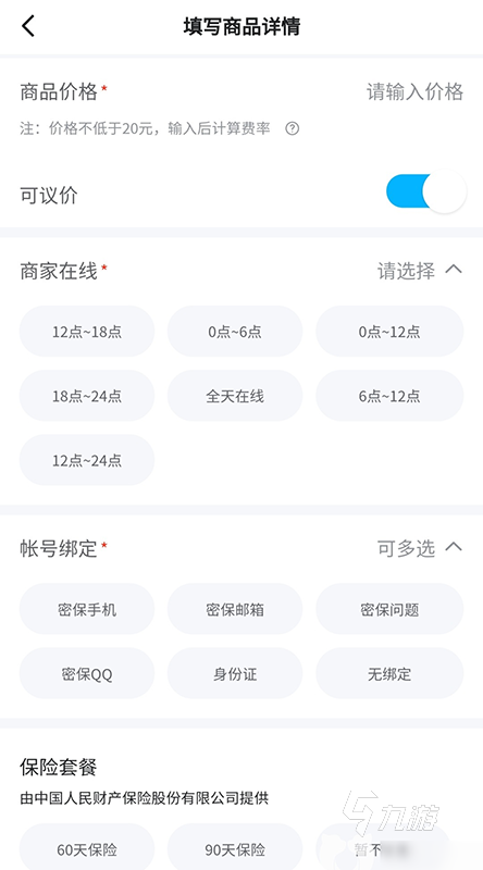 第三步,開始商品估價。按照游戲火爆程度、賬號等級、稀有資源和物品等情況,平臺給出合理的股價。當(dāng)買家對于估價有異議,填寫上自己心目中合理的價格。玩家同時還能填寫議價空間、賣家在線時間、賬號安全問題、保險等。交易貓匯集了成品號、自抽號、資產(chǎn)號等。