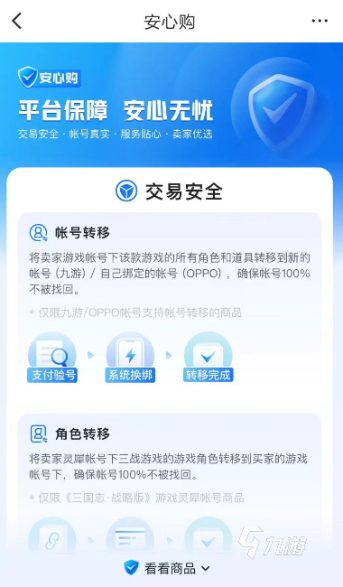 2、平臺為了讓每一個玩家安心的去進(jìn)行交易,部分商品是支持安心購這一服務(wù)的。該服務(wù)的出現(xiàn),證明當(dāng)前的商品直接得到了平臺的保障,進(jìn)行交易之前平臺就已經(jīng)幫助玩家了解了交易商品的真實性,所以各位可以放心去進(jìn)行購買。