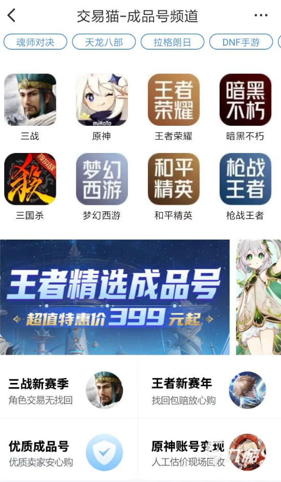 1、當(dāng)前的交易貓app中,直接開放了專屬于成品號的交易頻道。無論是端游還是手游,只要玩家想要找到自己感興趣的游戲類型,都可以在該頻道內(nèi)進(jìn)行獲取。各種高級別的游戲賬號,任由大家根據(jù)自己的要求來進(jìn)行挑選。