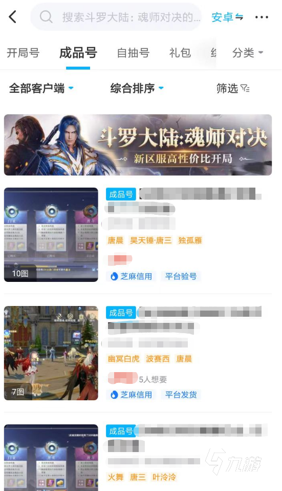 2、而對于只打算購買斗羅大陸魂師對決成品號的玩家而言,各位只需要進(jìn)入該游戲的交易專區(qū)即可。因?yàn)樵谶@里,大家可以輕松的找到大量高級游戲號,每一個游戲號其中的角色職業(yè)和魂獸都有著很大的差別,玩家可以利用這些差別來篩選自己滿意的游戲號。